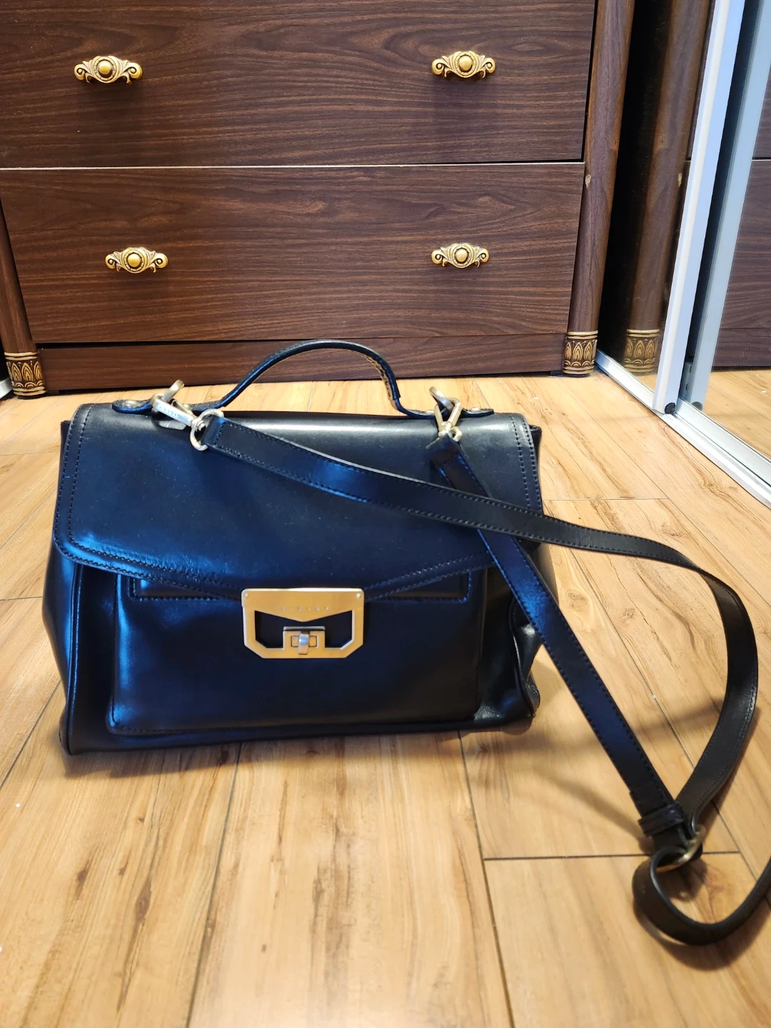 This is a stylish black leather handbag. It features a secure gold-tone clasp and comes with a detachable shoulder strap. Leather material.