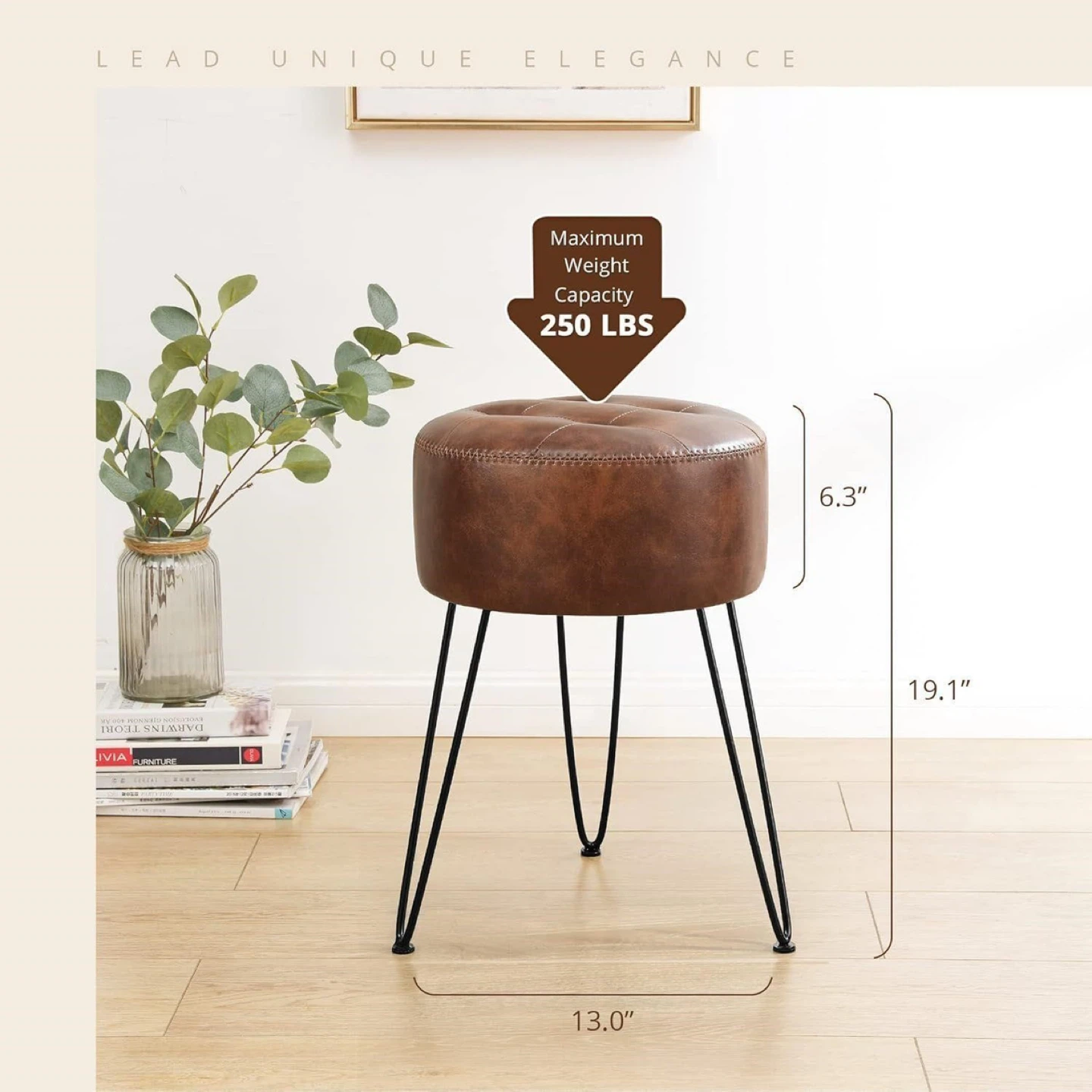 Add a touch of elegance to your space with this round ottoman stool! It features a premium faux leather fabric and high-density foam for comfortable seating. The sturdy stool structure and high-grade black legs ensure durability, and the waterproof leather makes it easy to clean. It has a maximum weight capacity of 250 lbs and measures 6.3" in height and 13" in diameter