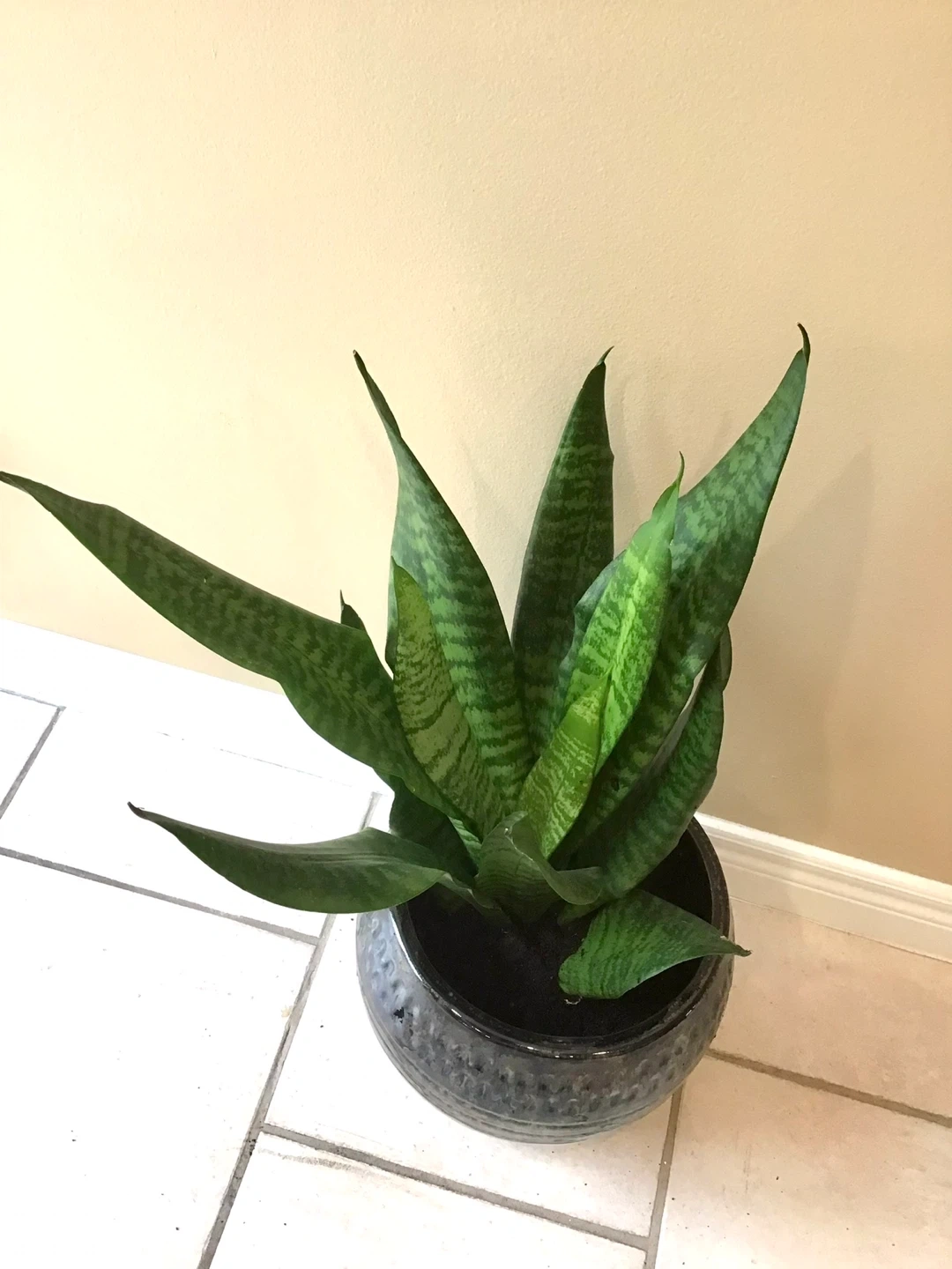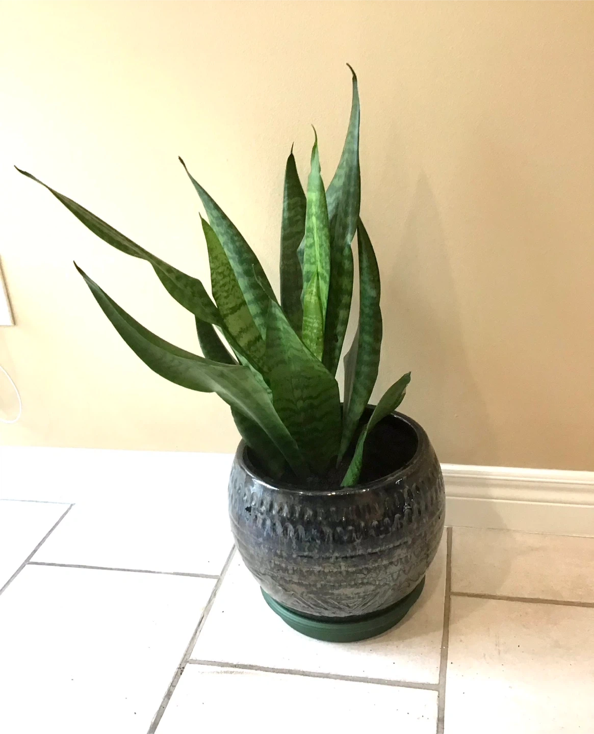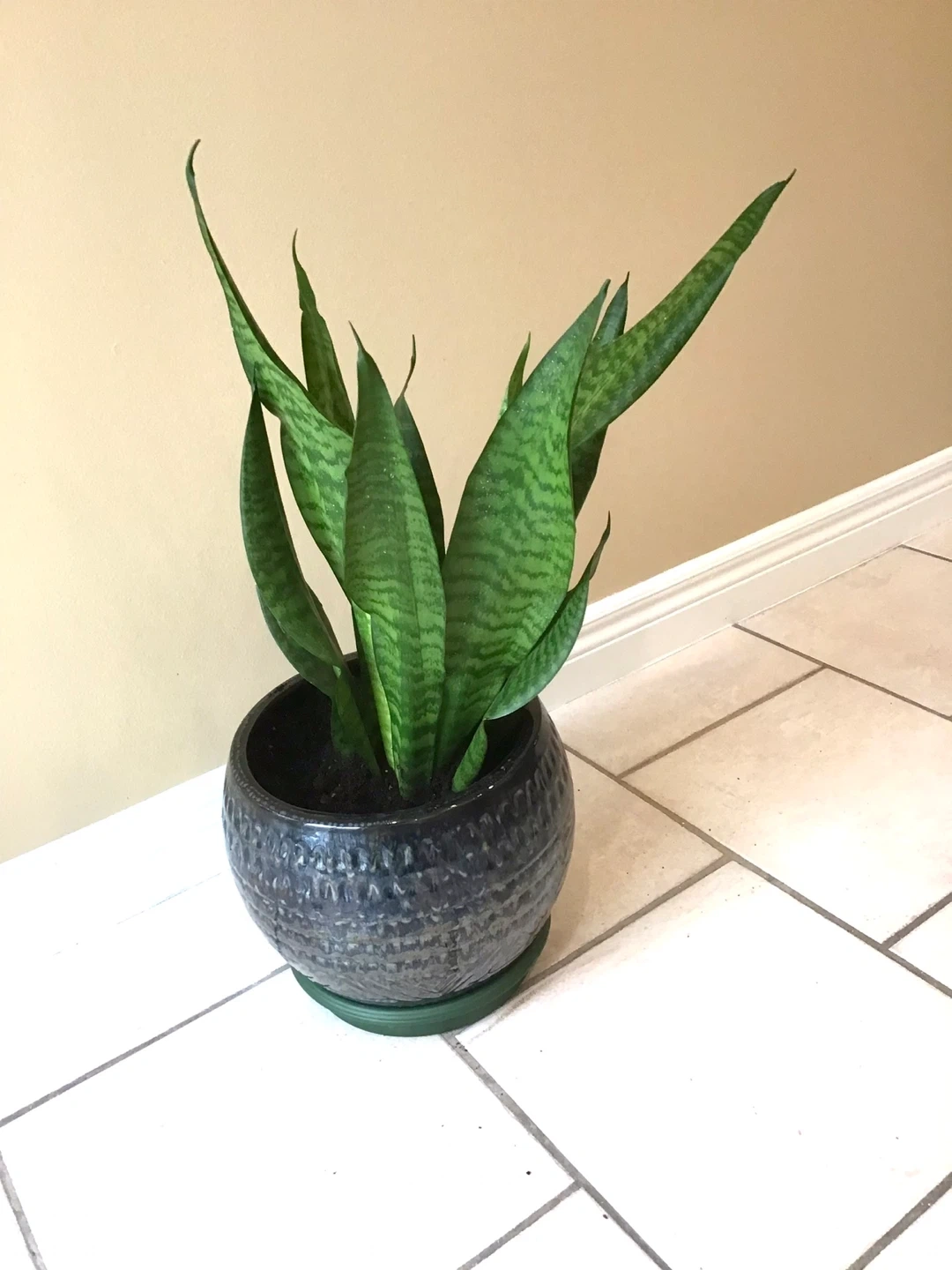 A healthy snake plant in a textured dark grey ceramic pot with a matching saucer. It's a low-maintenance houseplant.