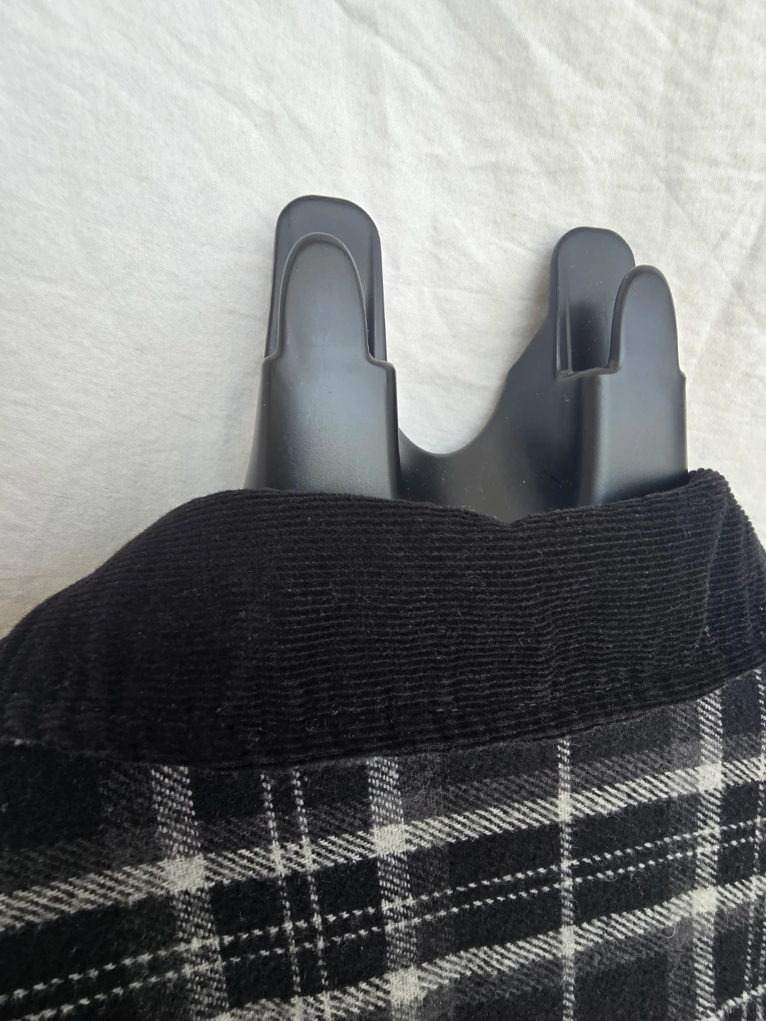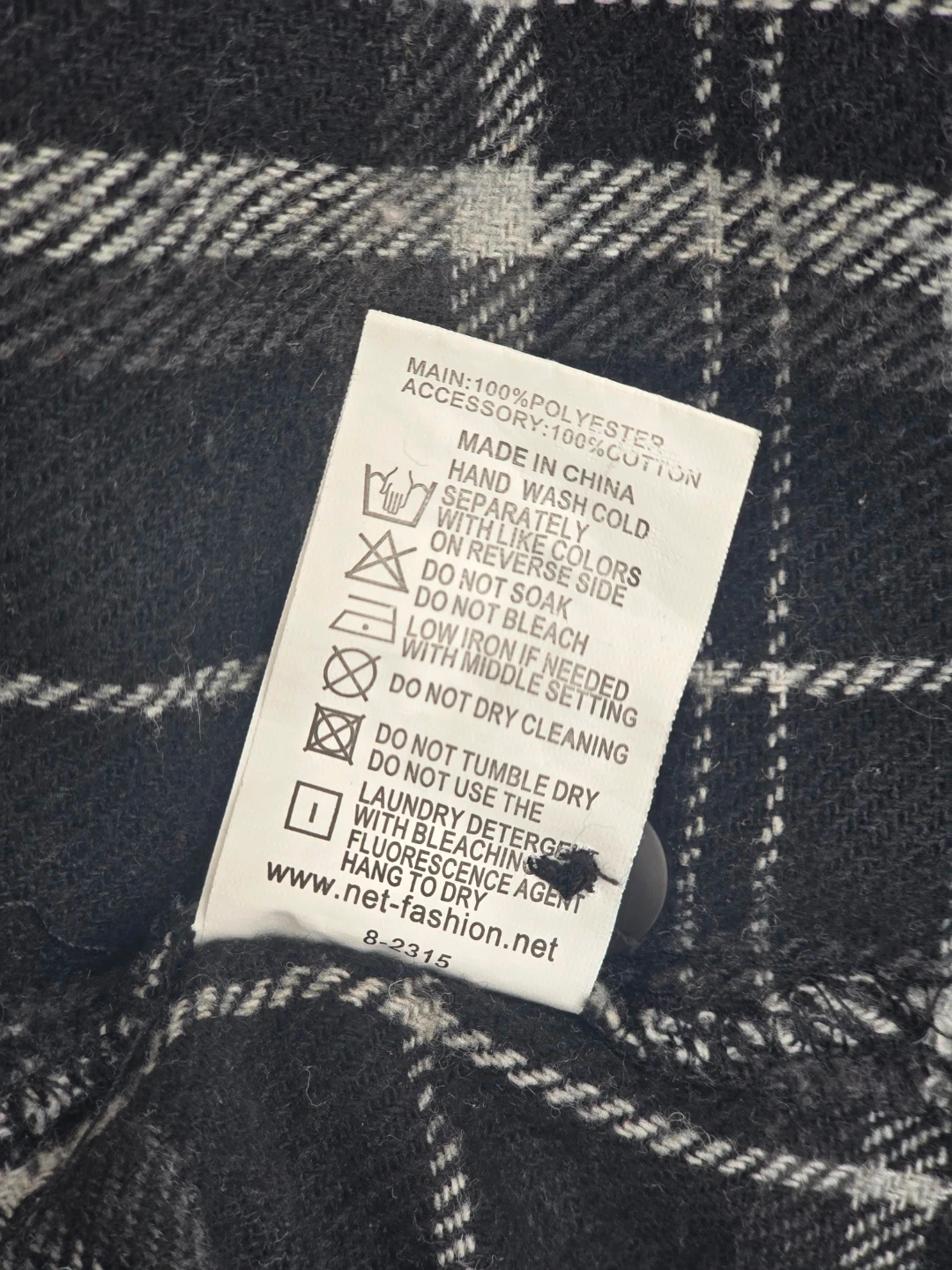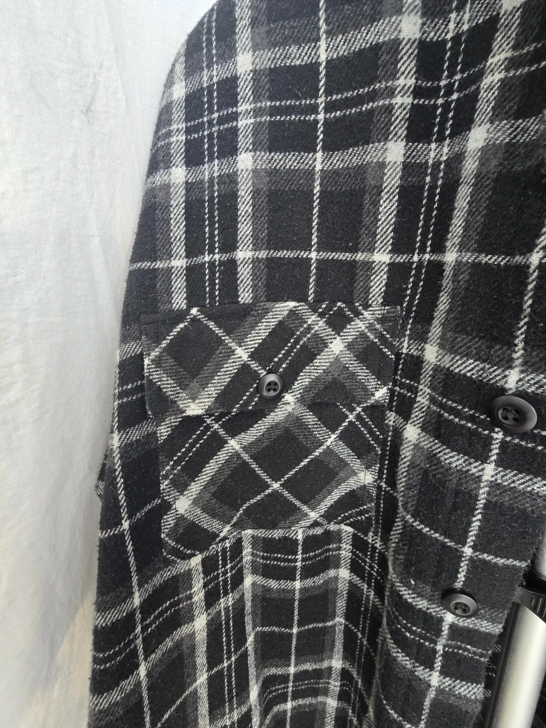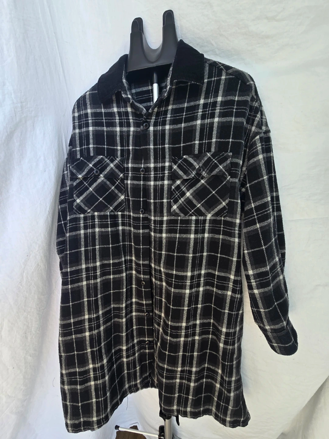 Cozy flannel shirt jacket (shacket) in a classic black and white plaid pattern. It has a button-up front and two chest pockets and two side pockets. The collar is a contrasting black corduroy. A great layering piece for cooler weather! Midback to the bottom is 39 inches, about knee length , its an oversized Medium, I usually fit LG or XL,