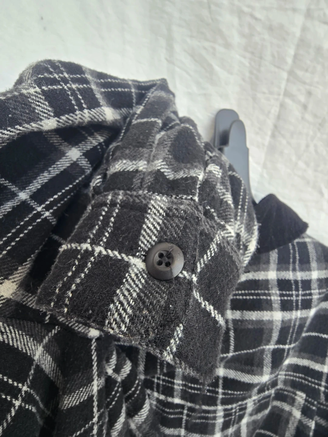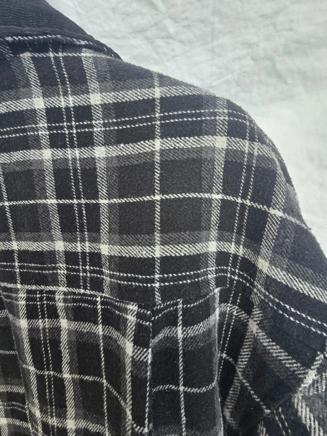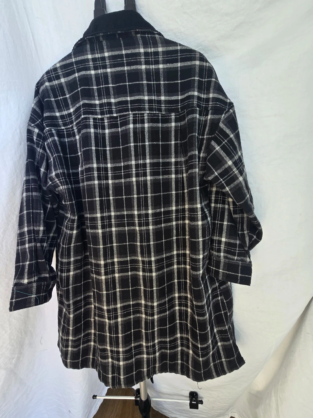 Cozy flannel shirt jacket (shacket) in a classic black and white plaid pattern. It has a button-up front and two chest pockets and two side pockets. The collar is a contrasting black corduroy. A great layering piece for cooler weather! Midback to the bottom is 39 inches, about knee length , its an oversized Medium, I usually fit LG or XL,