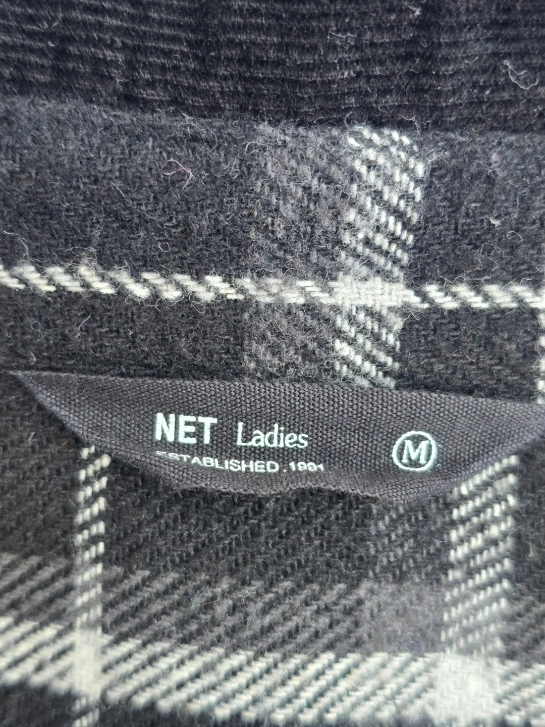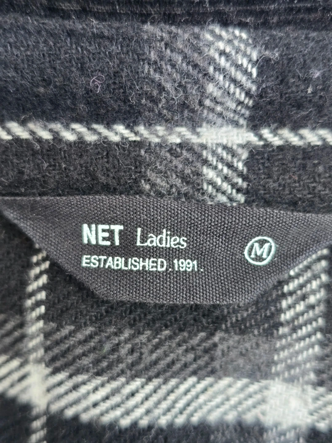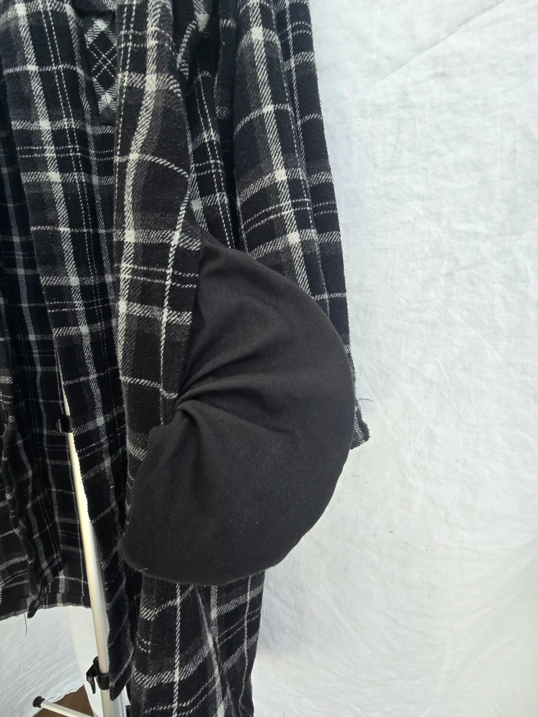 Cozy flannel shirt jacket (shacket) in a classic black and white plaid pattern. It has a button-up front and two chest pockets and two side pockets. The collar is a contrasting black corduroy. A great layering piece for cooler weather! Midback to the bottom is 39 inches, about knee length , its an oversized Medium, I usually fit LG or XL,