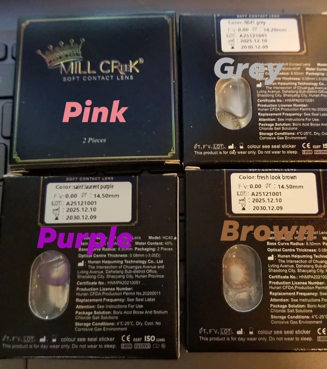 Mill Creek soft contact lenses. Each box contains a pair of lens. . These lenses have a base curve radius of 8.50mm and an optical centre thickness of 0.08mm (-3.00D). They are for day wear only and should not be worn to sleep.