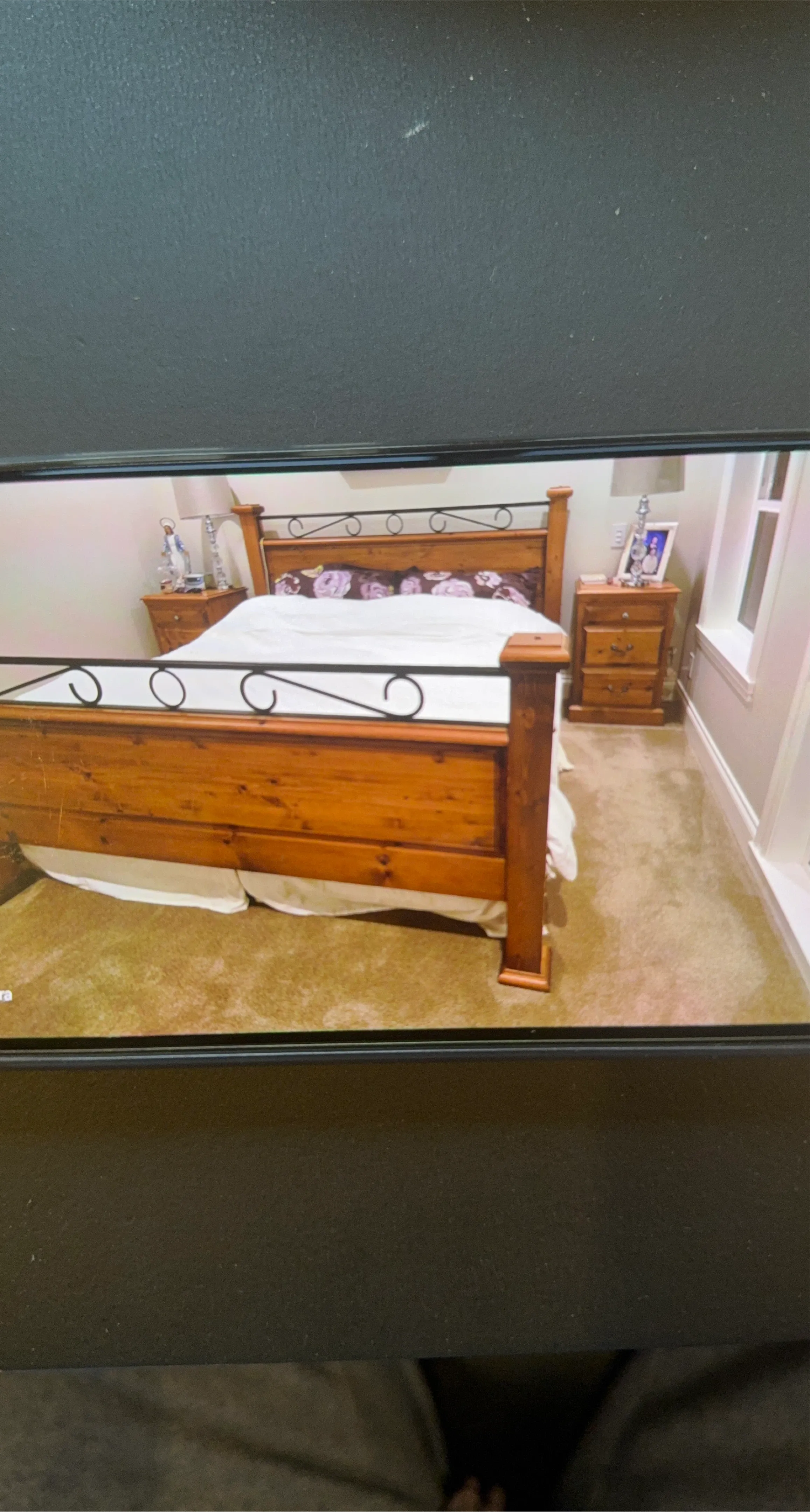 Solid wood bed frame featuring a warm wood finish and decorative metal scrollwork. Includes matching wooden headboard and footboard. Bedding and nightstands not included.
