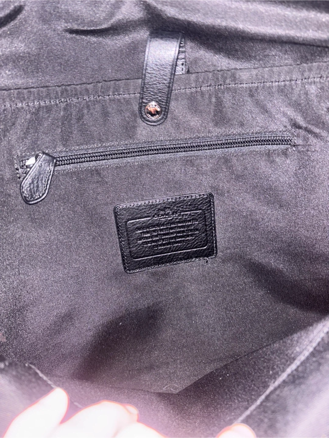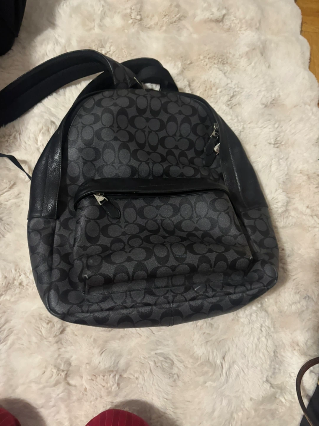 Selling a black Coach backpack. It features the Coach logo pattern throughout the bag. The backpack has a front pocket with a zipper and a main compartment with a zipper. It's in great condition and perfect for everyday use