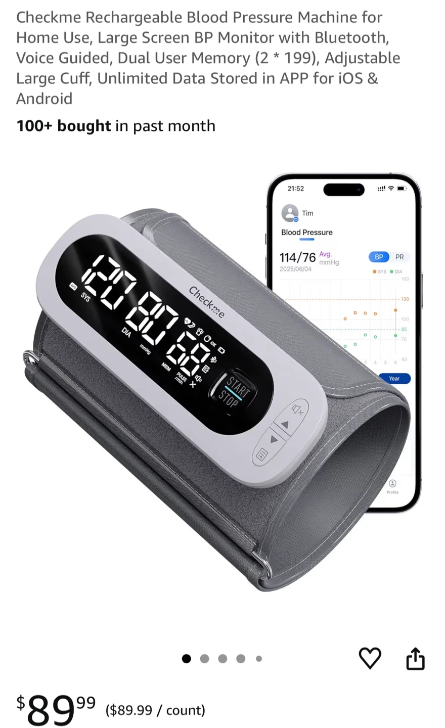 Checkme Rechargeable Blood Pressure Machine for Home Use, Large Screen BP Monitor with Bluetooth, Voice Guided, Dual User Memory (2 * 199), Adjustable Large Cuff, Unlimited Data Stored in APP for iOS & Android