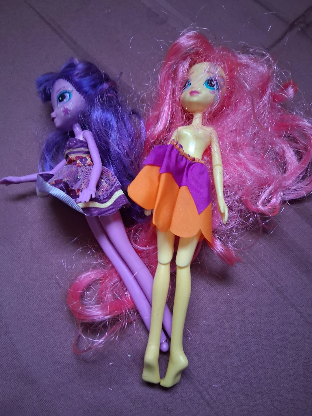 Two My Little Pony Equestria Girls dolls included. One has purple hair and the other has pink hair. They're both wearing skirts. Great for collectors or playtime!