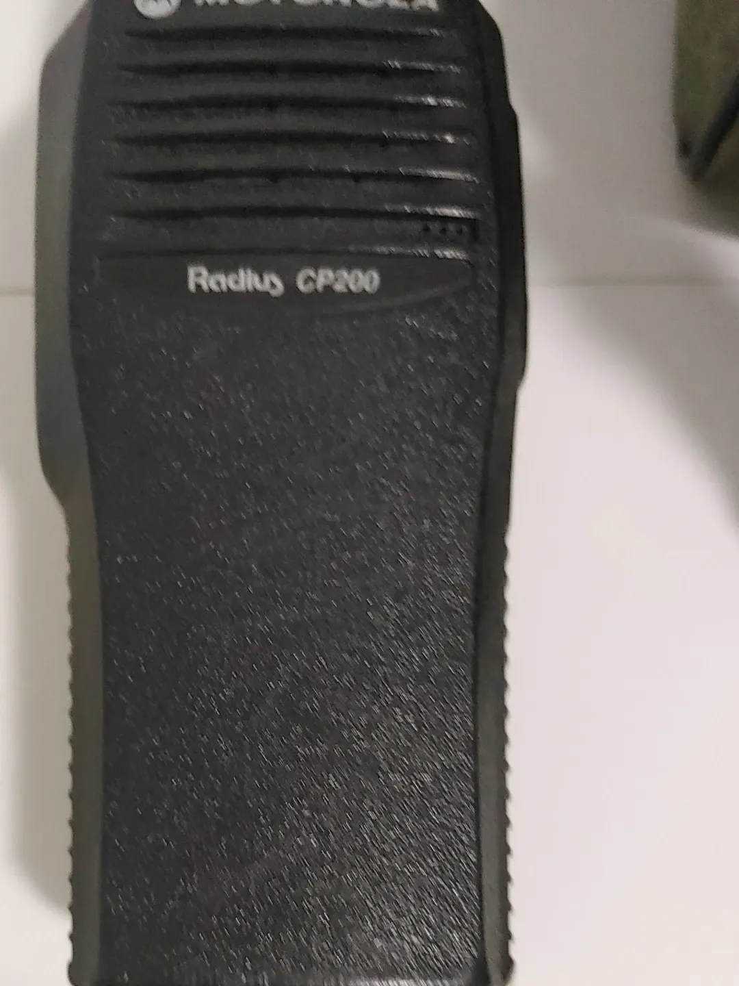 Motorola Radius CP200 two-way radio. This handheld device is black and made of durable plastic. It's perfect for communication on job sites or for outdoor activities.