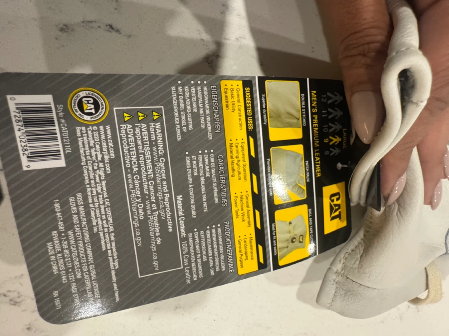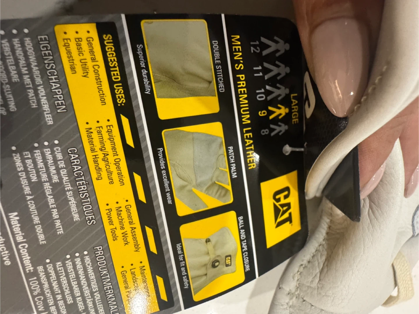 Get the job done right with these CAT men's premium leather work gloves! They're size large and made from 100% cow leather for durability and comfort. These gloves feature a palm patch, adjustable ball and tape closure, and double stitching in high wear areas. Perfect for general construction, farming, material handling, machine work, and landscaping