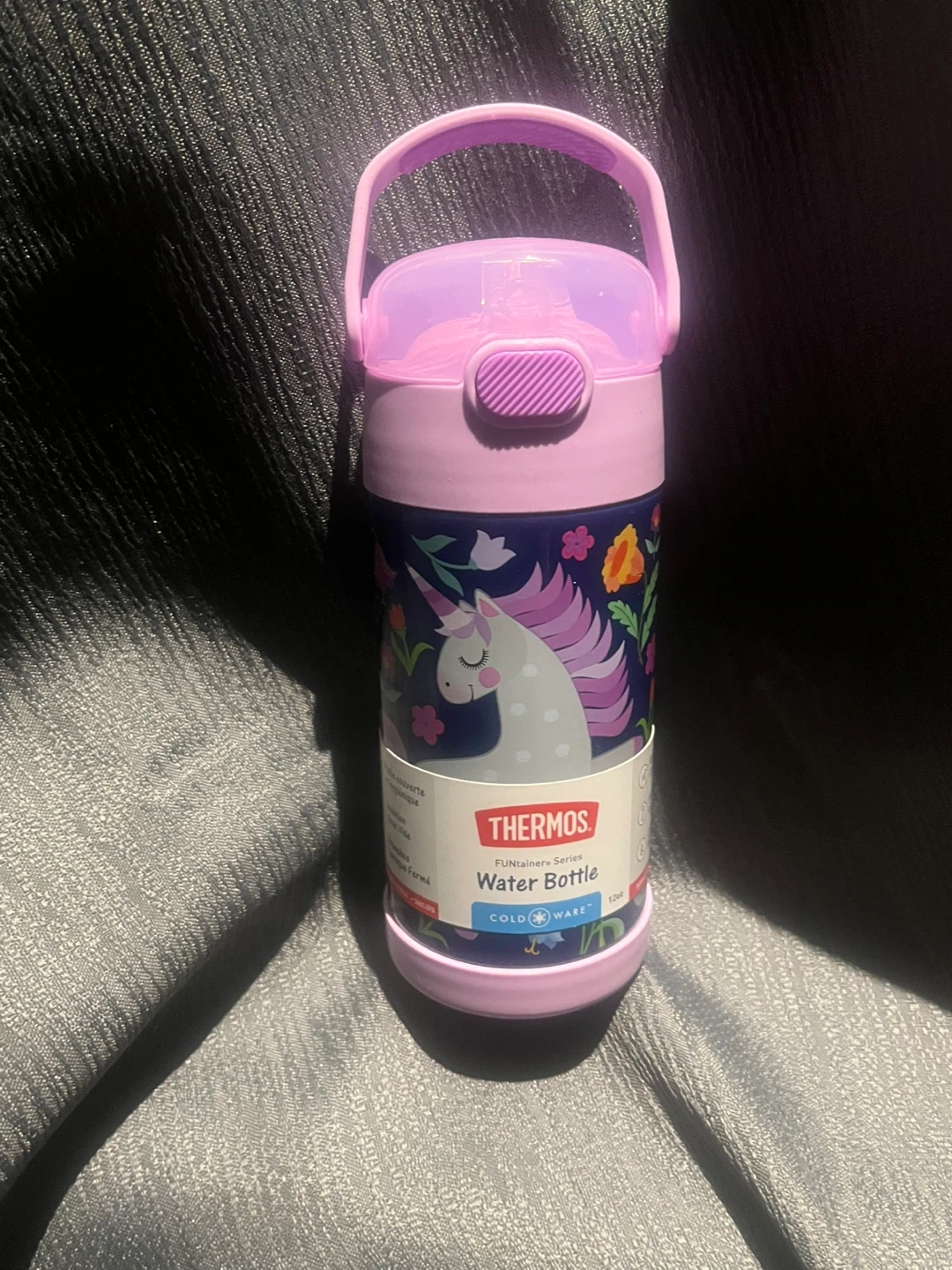 This Thermos water bottle features a fun unicorn design. It keeps cold for 12 hours. The bottle has a convenient carry handle and a push-button lid with a straw.