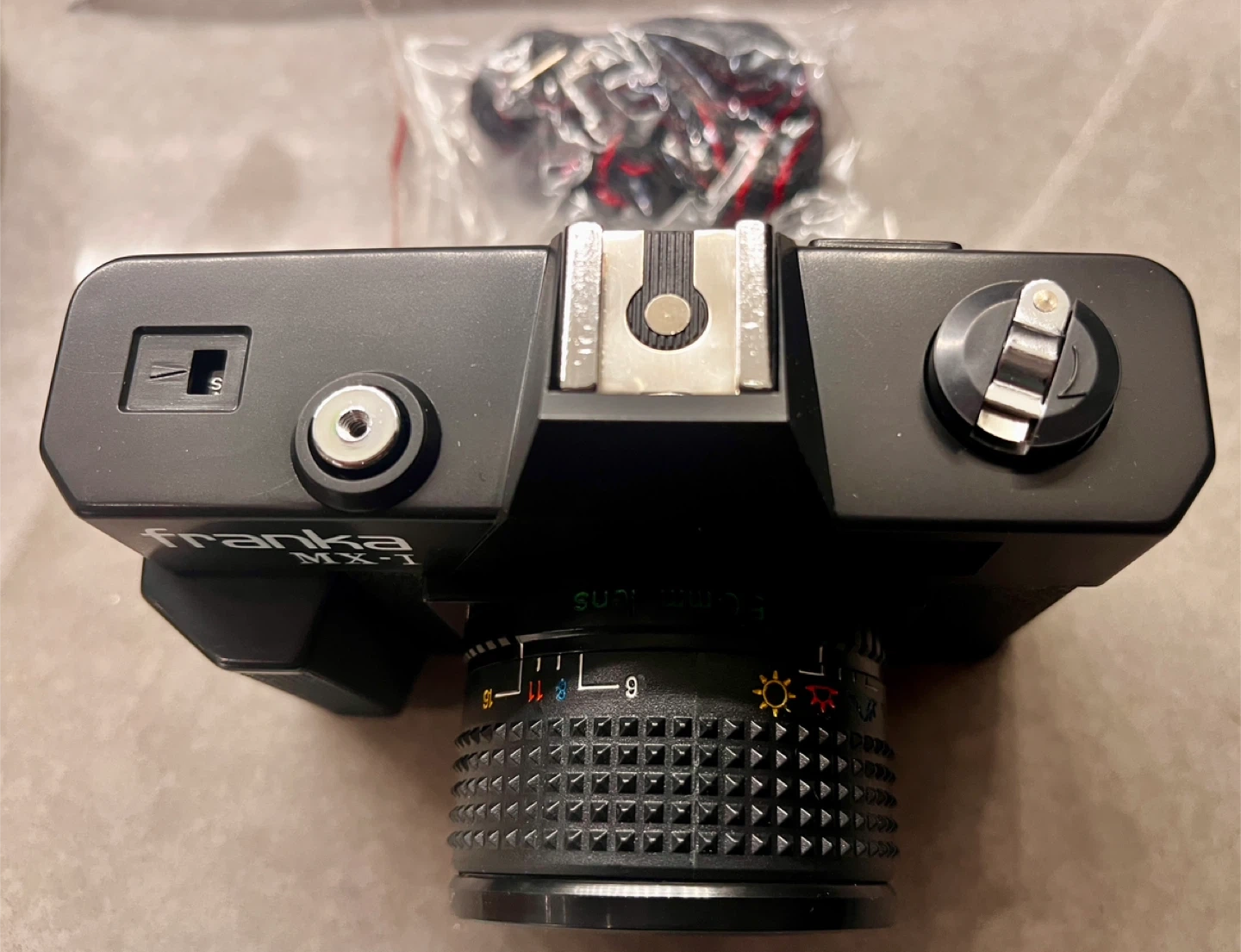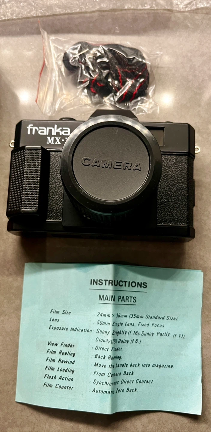 This is a Franka MX-1 film camera with a 50mm lens. It's a classic camera for capturing moments. It includes a lens cap.