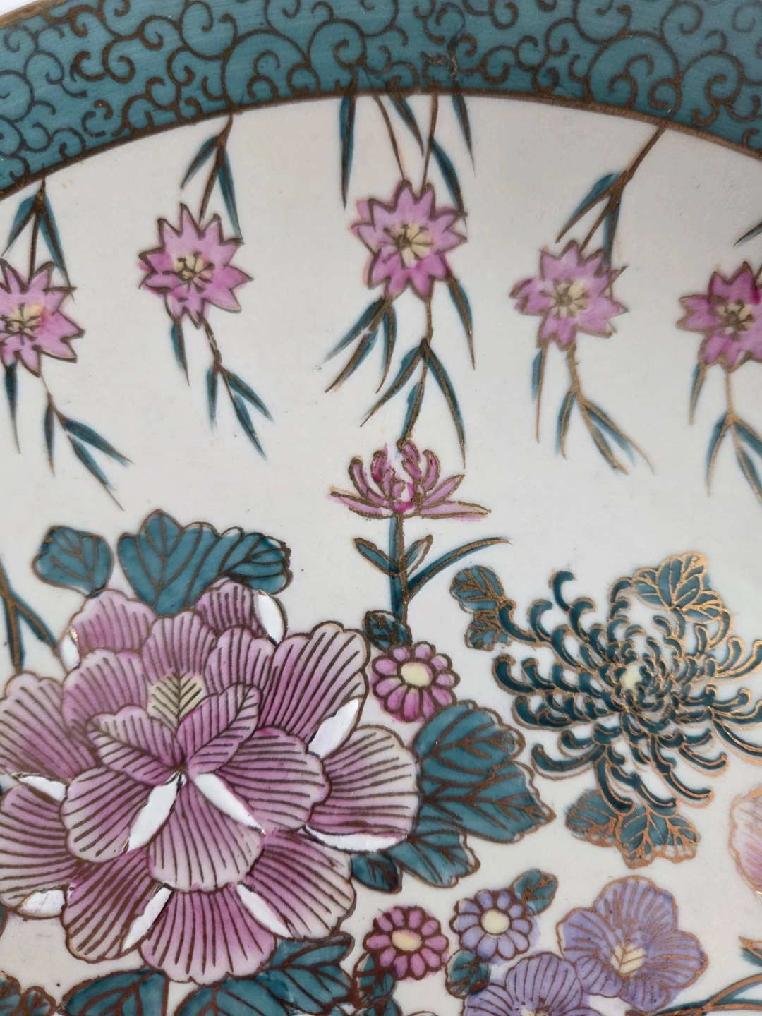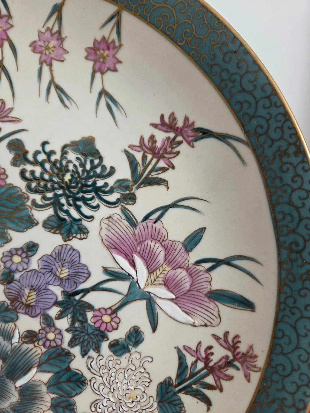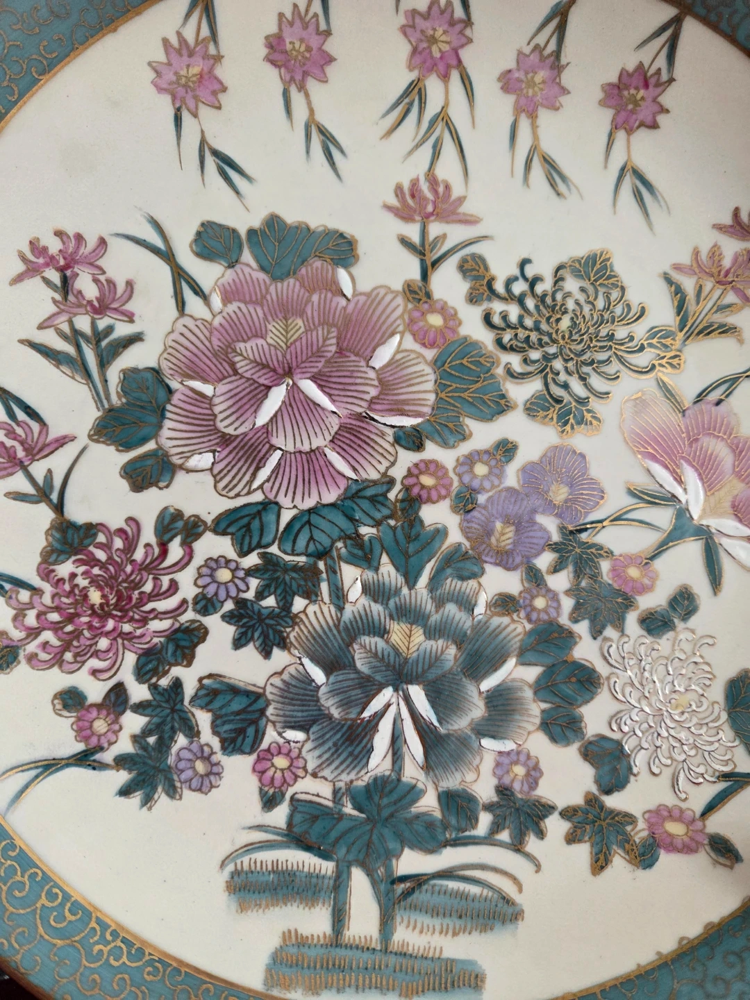 A ceramic plate adorned with a vibrant floral design in pinks, purples, and teal. It features a decorative gold and teal border. This plate's intricate design makes it a lovely decorative piece.