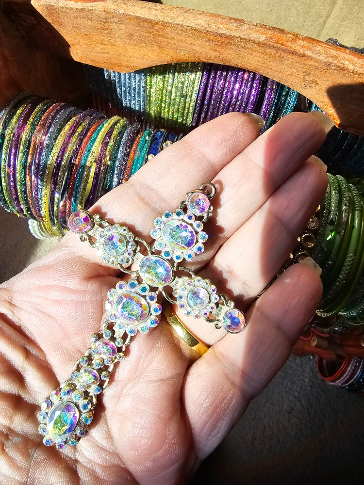 A beautiful cross pendant necklace with iridescent stones. It's in great condition and ready to add some sparkle to your outfit!