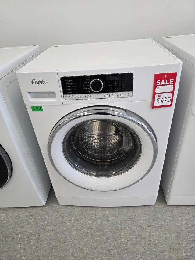 Whirlpool WFW5090GW Front Load Washer. It's a 24" compact size, perfect for condos and small spaces, with a 2.3 cu. ft. capacity. Features include 10 wash cycles, 6 temperature settings, and a spin speed of 1,200 RPM. The stainless steel drum and TumbleFresh™ technology help keep clothes fresh and wrinkle-free for up to 6 hours. It also has Quick Wash, Handwash & Wool cycles, a Cold Water PreWash for stains, and Tap Touch controls with memory. This model is stackable and ENERGY STAR® Certified. Let me know if you're interested!