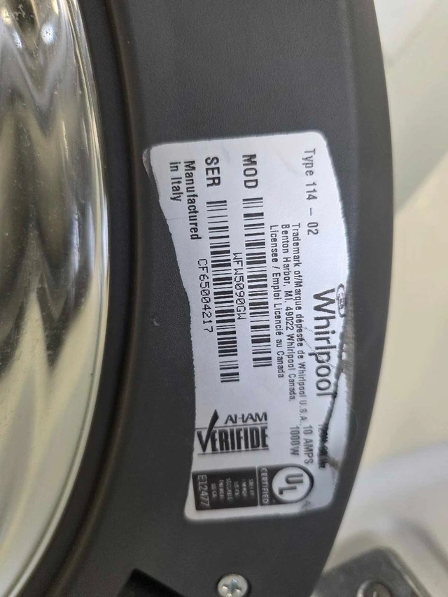 Whirlpool WFW5090GW Front Load Washer. It's a 24" compact size, perfect for condos and small spaces, with a 2.3 cu. ft. capacity. Features include 10 wash cycles, 6 temperature settings, and a spin speed of 1,200 RPM. The stainless steel drum and TumbleFresh™ technology help keep clothes fresh and wrinkle-free for up to 6 hours. It also has Quick Wash, Handwash & Wool cycles, a Cold Water PreWash for stains, and Tap Touch controls with memory. This model is stackable and ENERGY STAR® Certified. Let me know if you're interested!