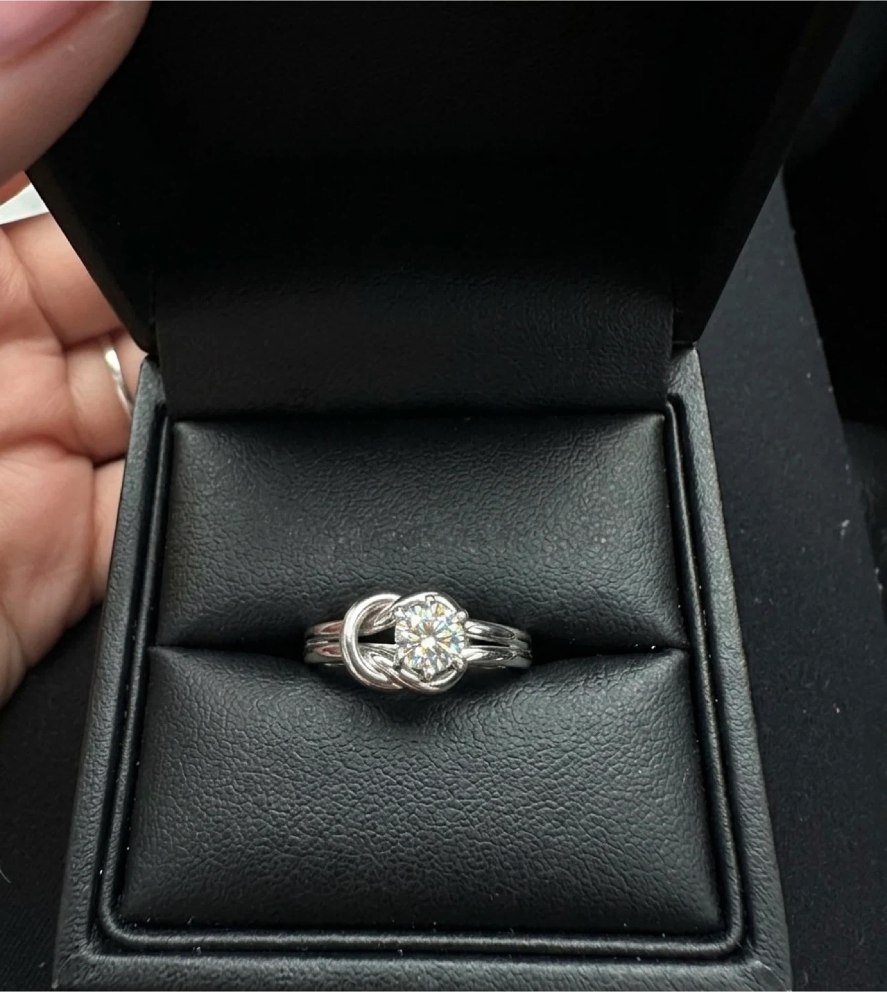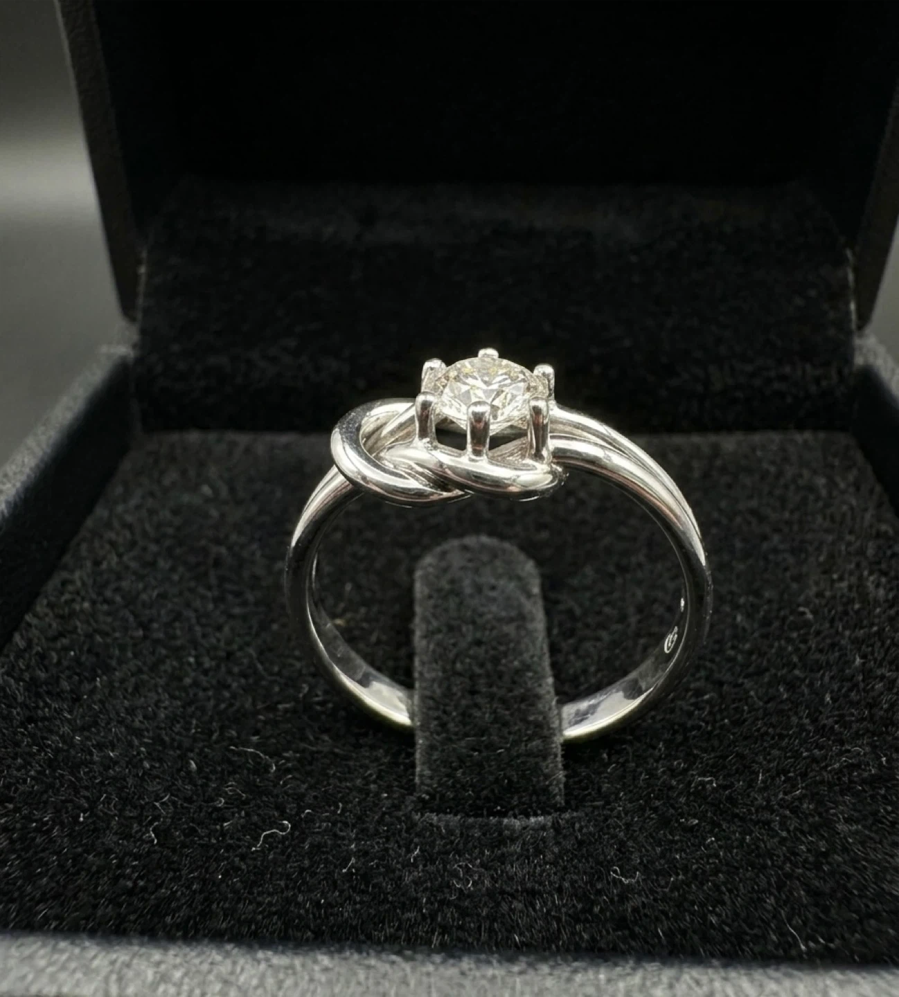 Elegant love knot design ring crafted in platinum (approx. 5 grams). Features a 0.5 carat natural diamond with VS clarity and a G–H colour grade, certified by Gemologist.