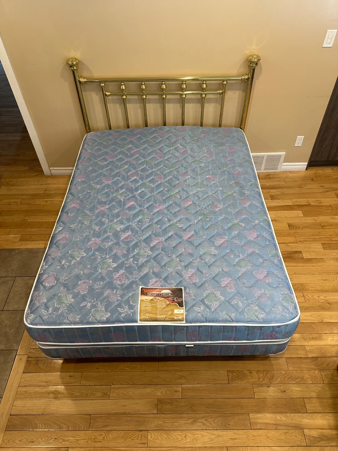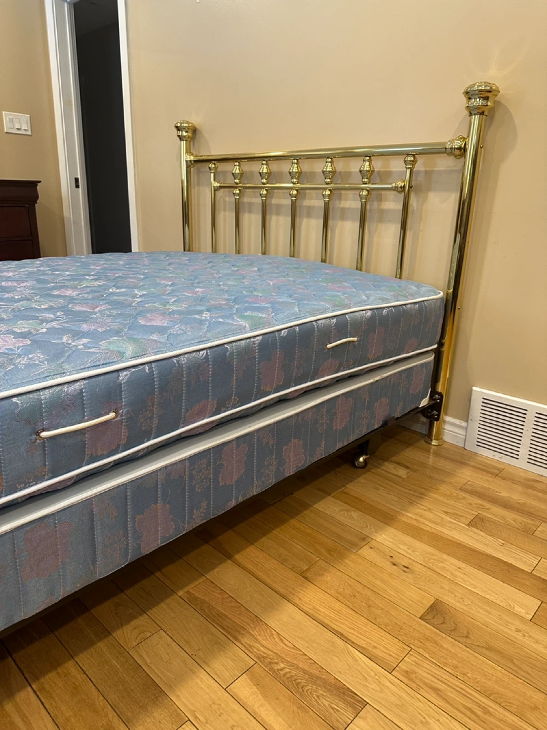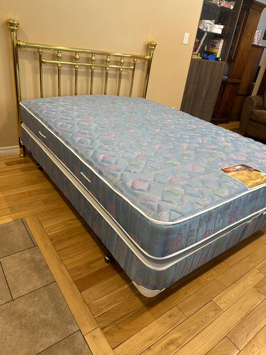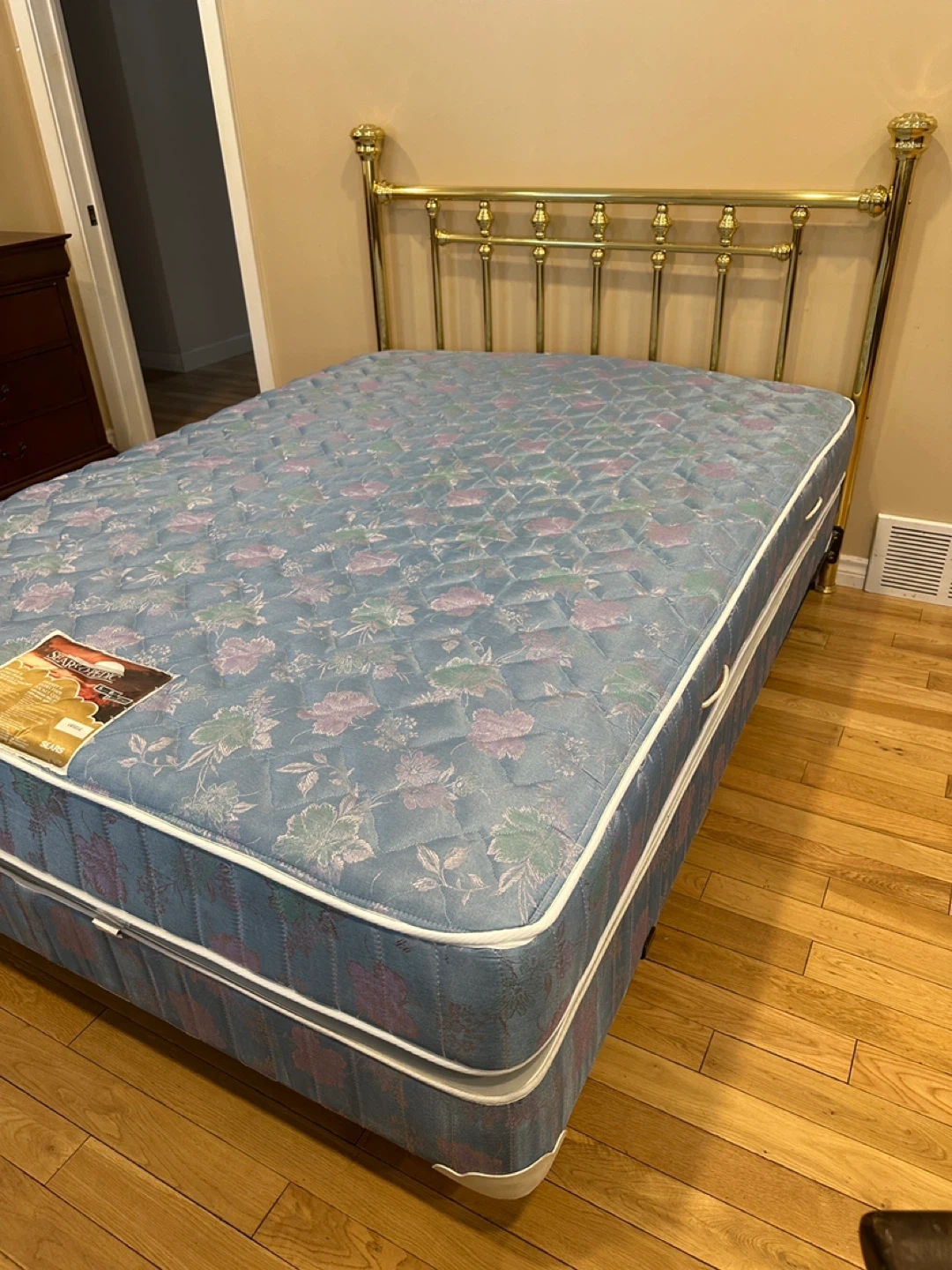 Beautiful and sturdy queen bed set, everything included and ready to use! The brass headboard has a classic, elegant design that gives the room a timeless look. Frame is solid and stable. Mattress and boxspring are clean and in good condition.