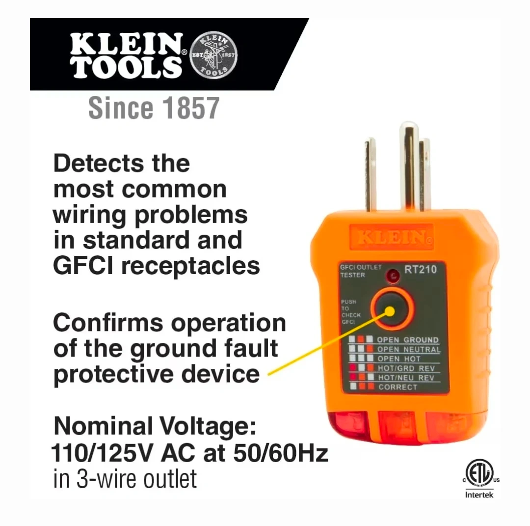 Klein Tools NCVT-1P non-contact voltage tester detects 50-1000V AC. Includes RT210 GFCI outlet tester that checks for common wiring issues in standard and GFCI receptacles. Auto power-off function on the voltage tester conserves battery life.