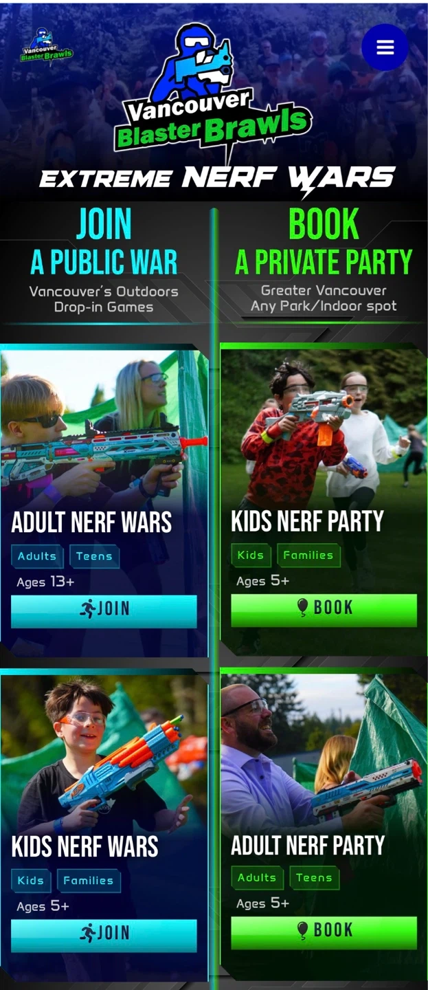 Let them run wild. Team-based, objective-driven Nerf battles for kids and families — because the kids who play big — grow up to be the most fun adults!