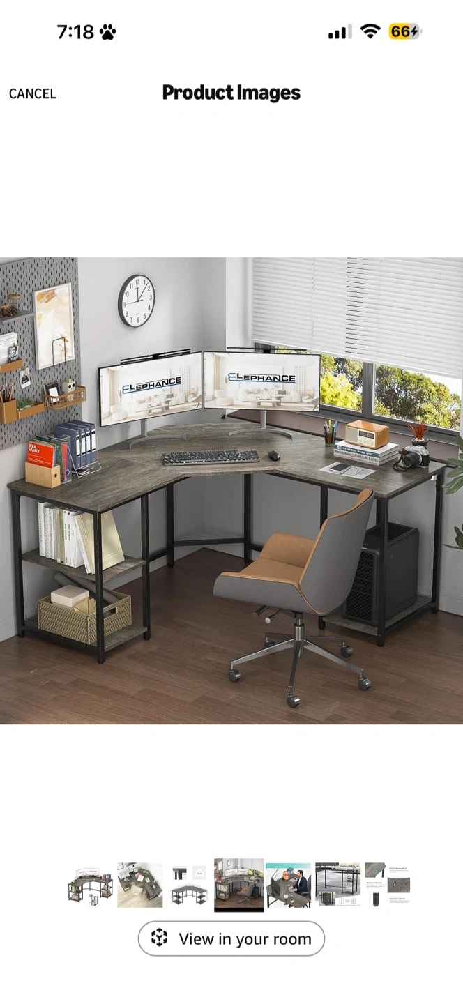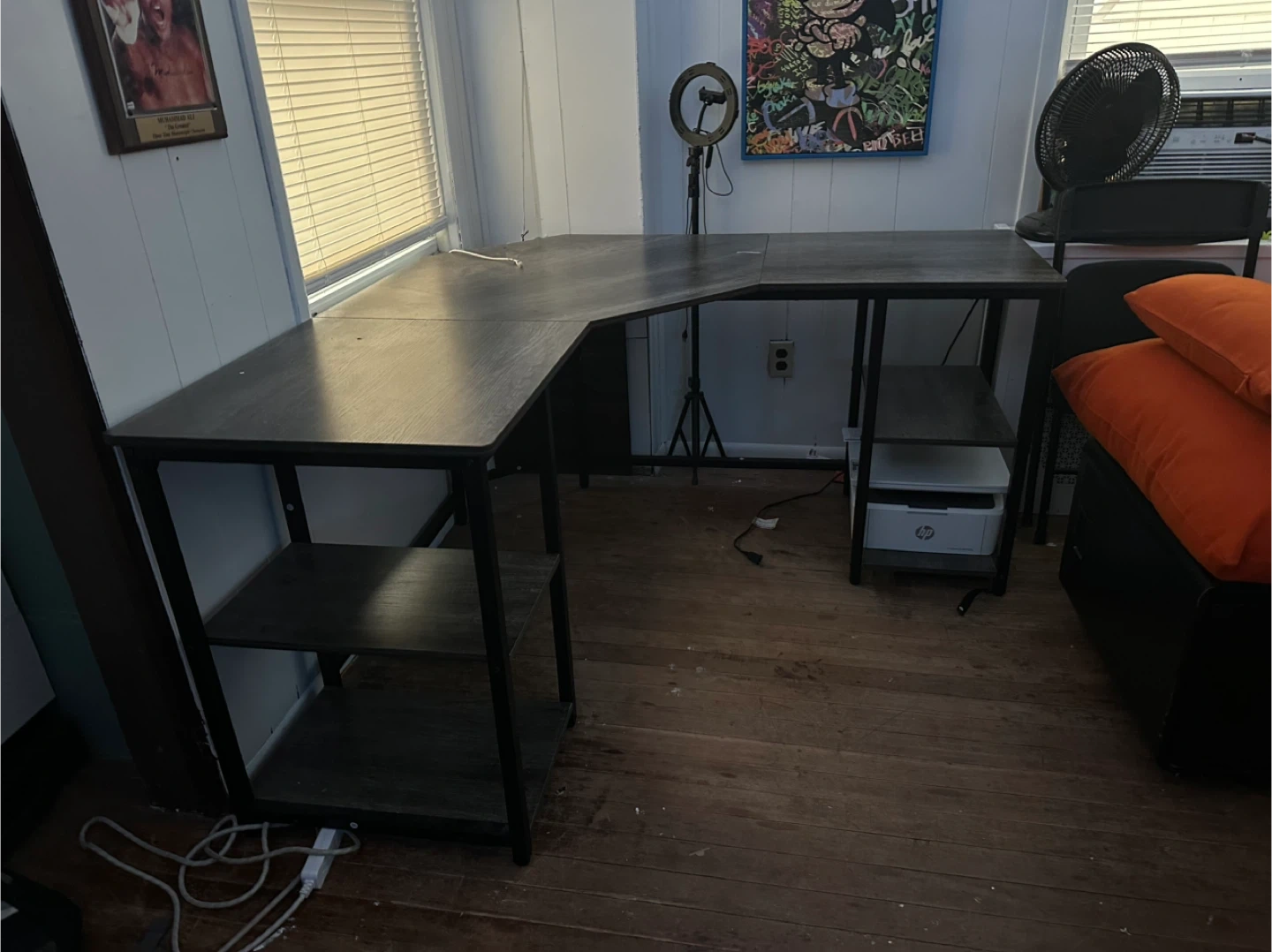 This L-shaped computer desk offers ample workspace and storage with its built-in shelves. It's designed for corner placement, maximizing your room's layout. The black oak finish provides a modern look for your home office or gaming setup.