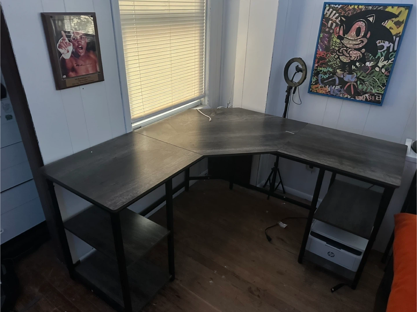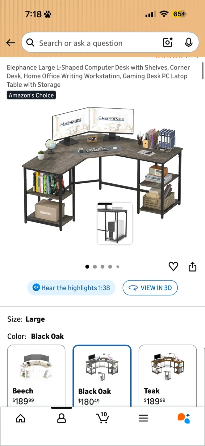 This L-shaped computer desk offers ample workspace and storage with its built-in shelves. It's designed for corner placement, maximizing your room's layout. The black oak finish provides a modern look for your home office or gaming setup.