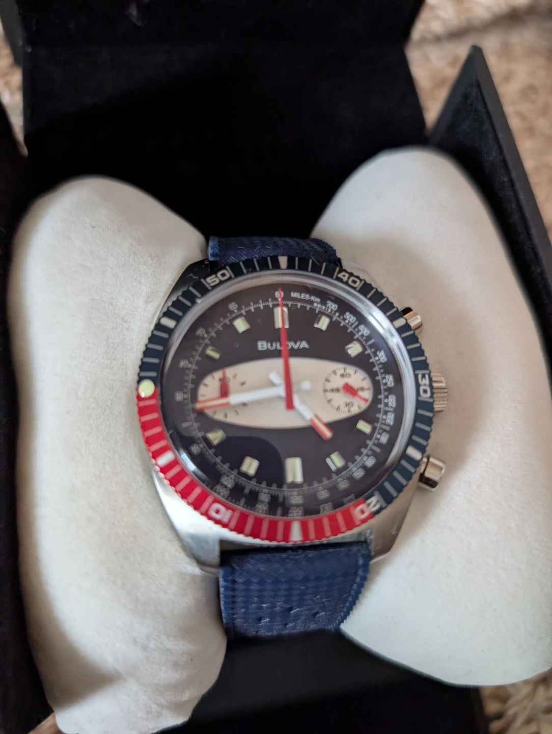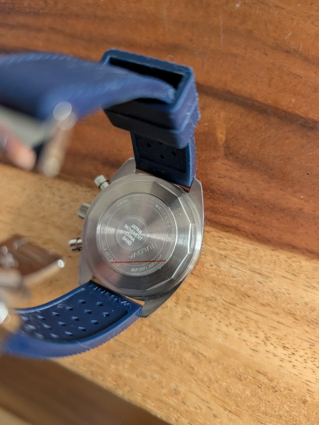 This is a Bulova chronograph watch with a blue rubber strap. It features a Japanese quartz movement.