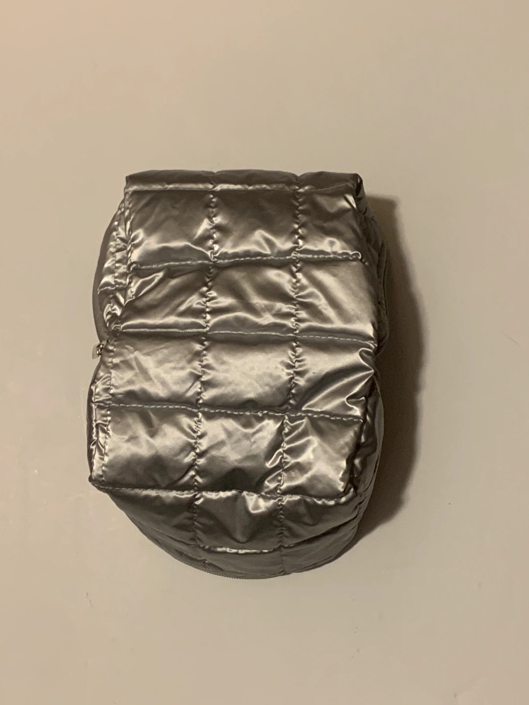 This is a shiny silver quilted cosmetic bag with a zipper closure. It's great for storing everyday use makeup or travel essentials. The interior is light grey and it's a handy size for your purse or luggage.