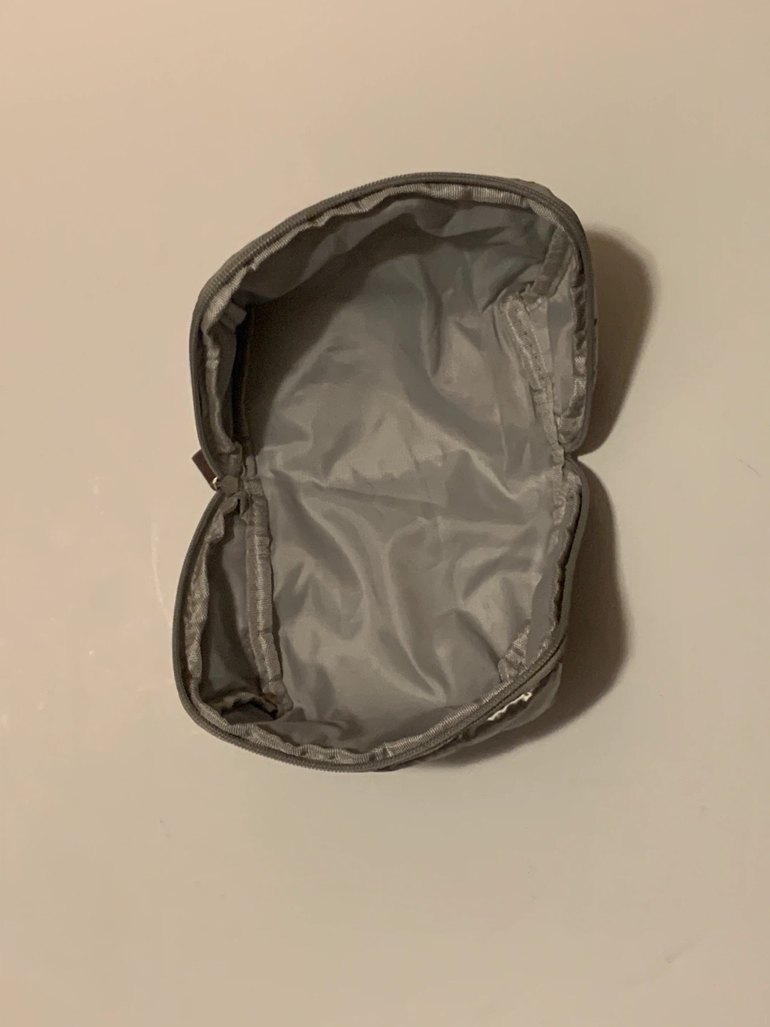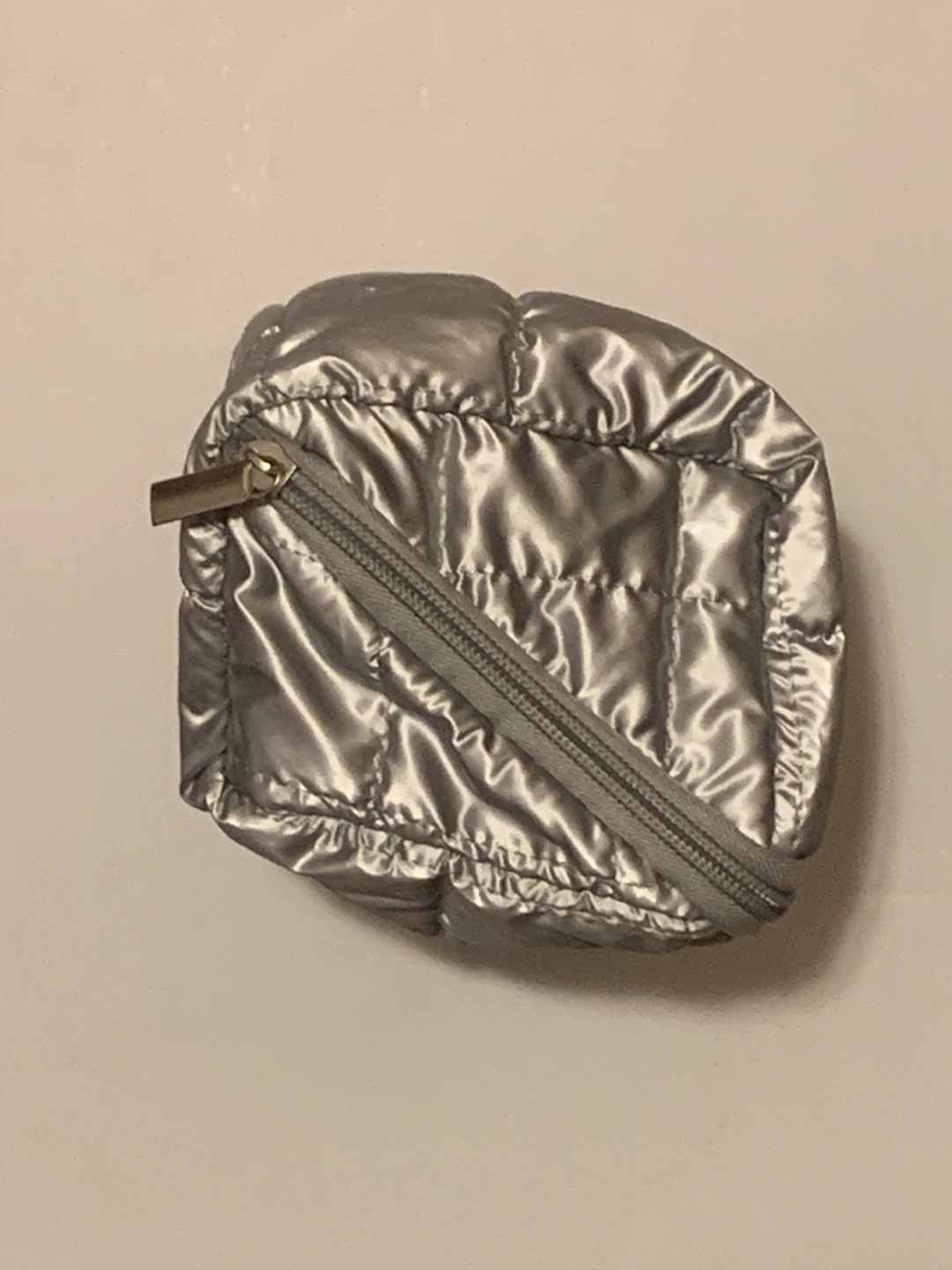 This is a shiny silver quilted cosmetic bag with a zipper closure. It's great for storing everyday use makeup or travel essentials. The interior is light grey and it's a handy size for your purse or luggage.