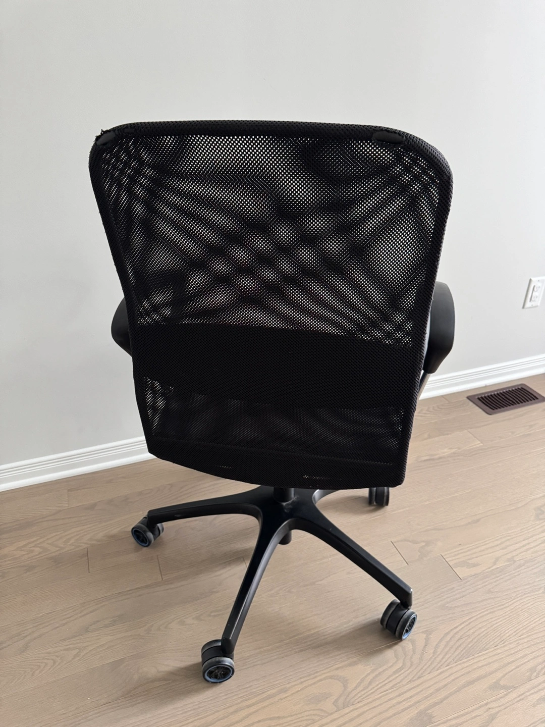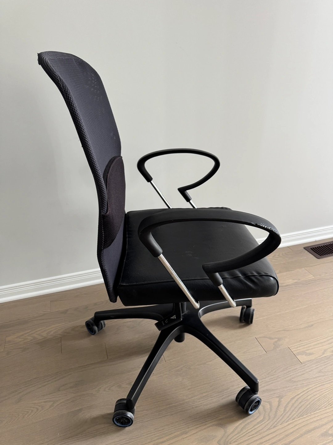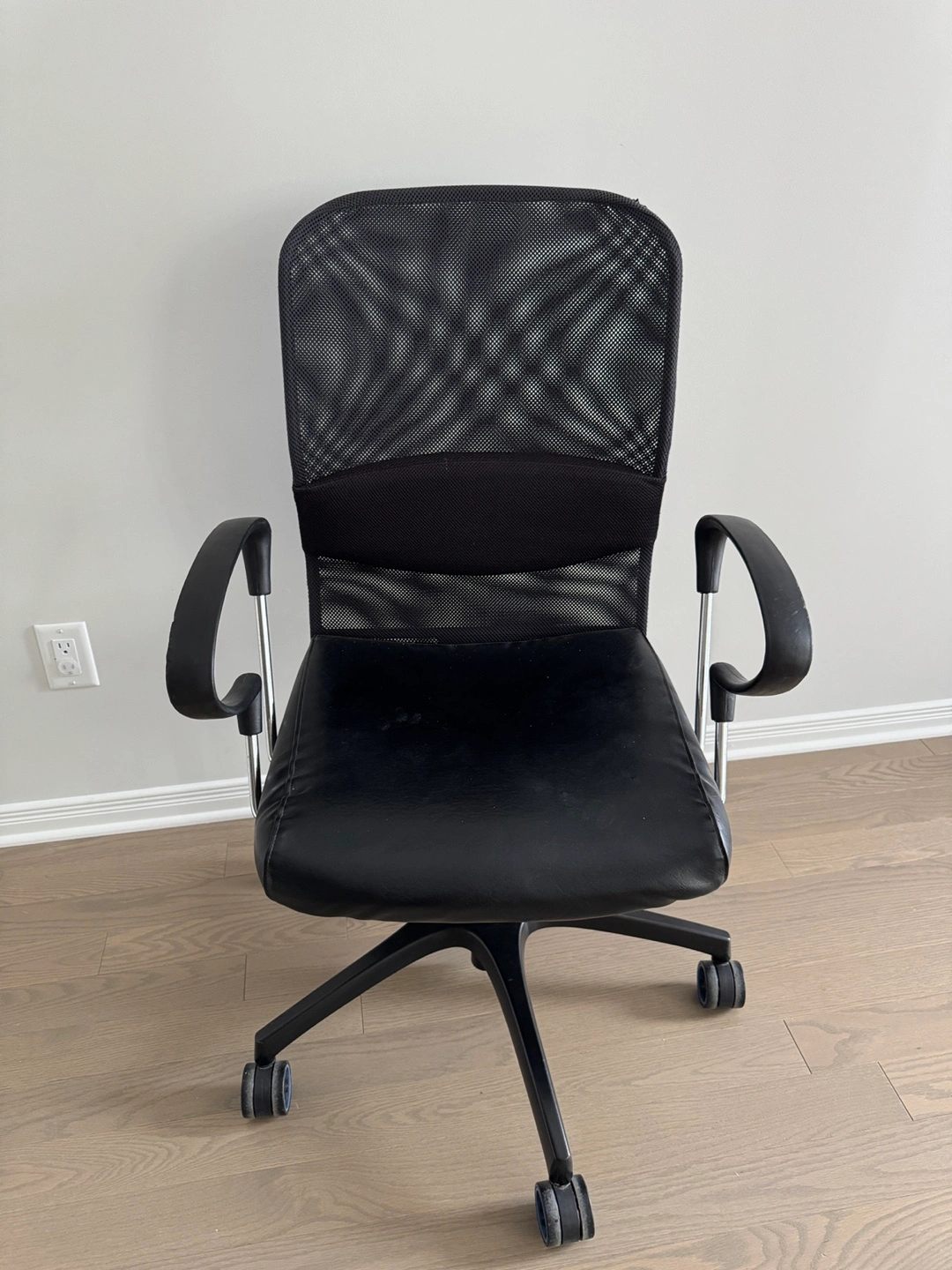 Comfortable office chair. Features a mesh back and padded seat. Black leatherette upholstery. Five rolling casters. Armrests are adjustable.