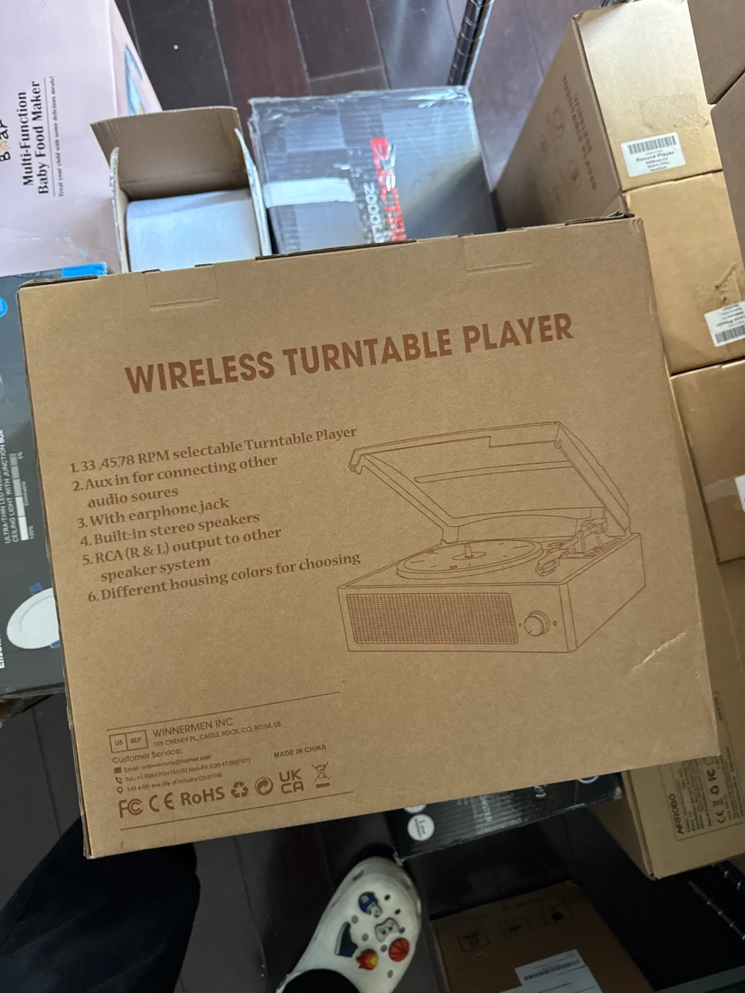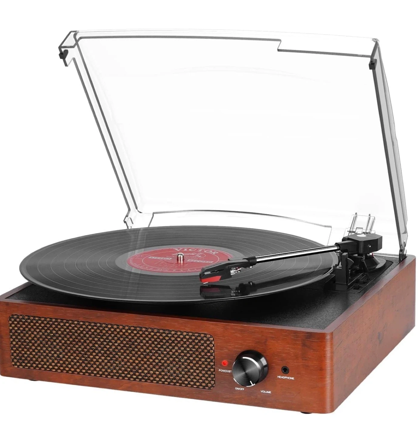 This wireless turntable player features selectable 1.33, 3, 45 RPM speeds. It has a 45 single adaptor and built-in stereo speakers. It also comes with an earphone jack and aux-in for connecting other audio sources. The turntable measures 12.80 inches wide, 10.83 inches deep, and 4.72 inches high with the lid closed.