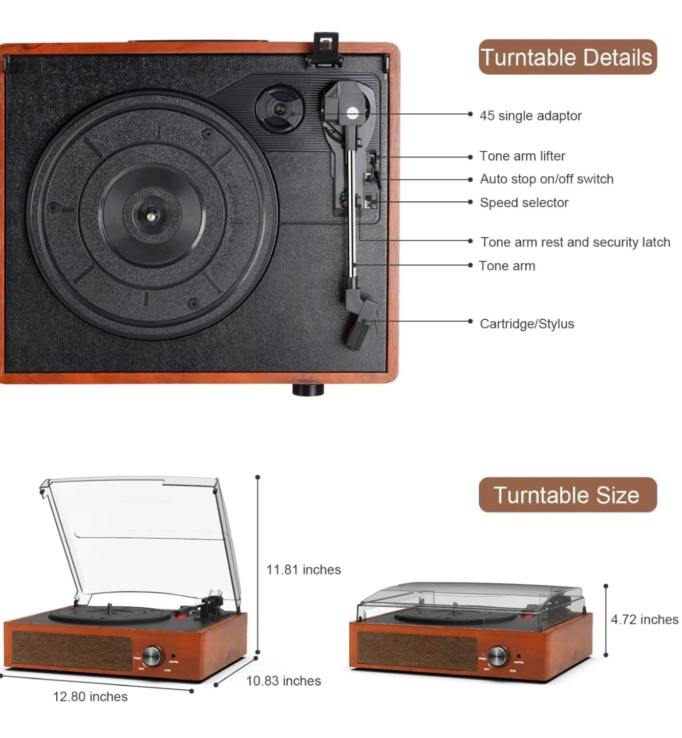 This wireless turntable player features selectable 1.33, 3, 45 RPM speeds. It has a 45 single adaptor and built-in stereo speakers. It also comes with an earphone jack and aux-in for connecting other audio sources. The turntable measures 12.80 inches wide, 10.83 inches deep, and 4.72 inches high with the lid closed.