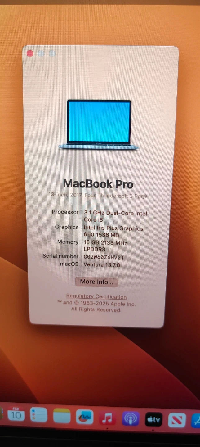 This is a 2017 MacBook Pro with a 3.1 GHz Dual-Core Intel Core i5 processor and 16 GB of memory and 256gb storage. It runs on macOS Ventura 13.7.8. This model has 4 Thunderbolt 3 ports.