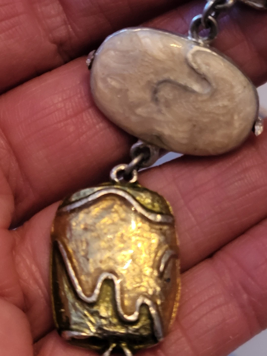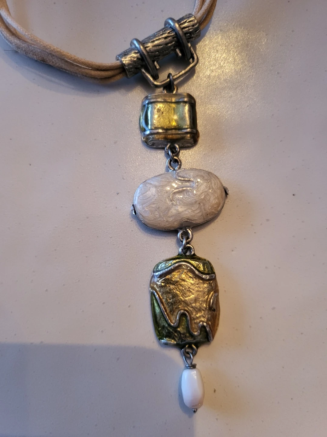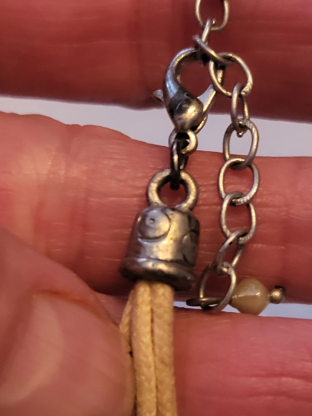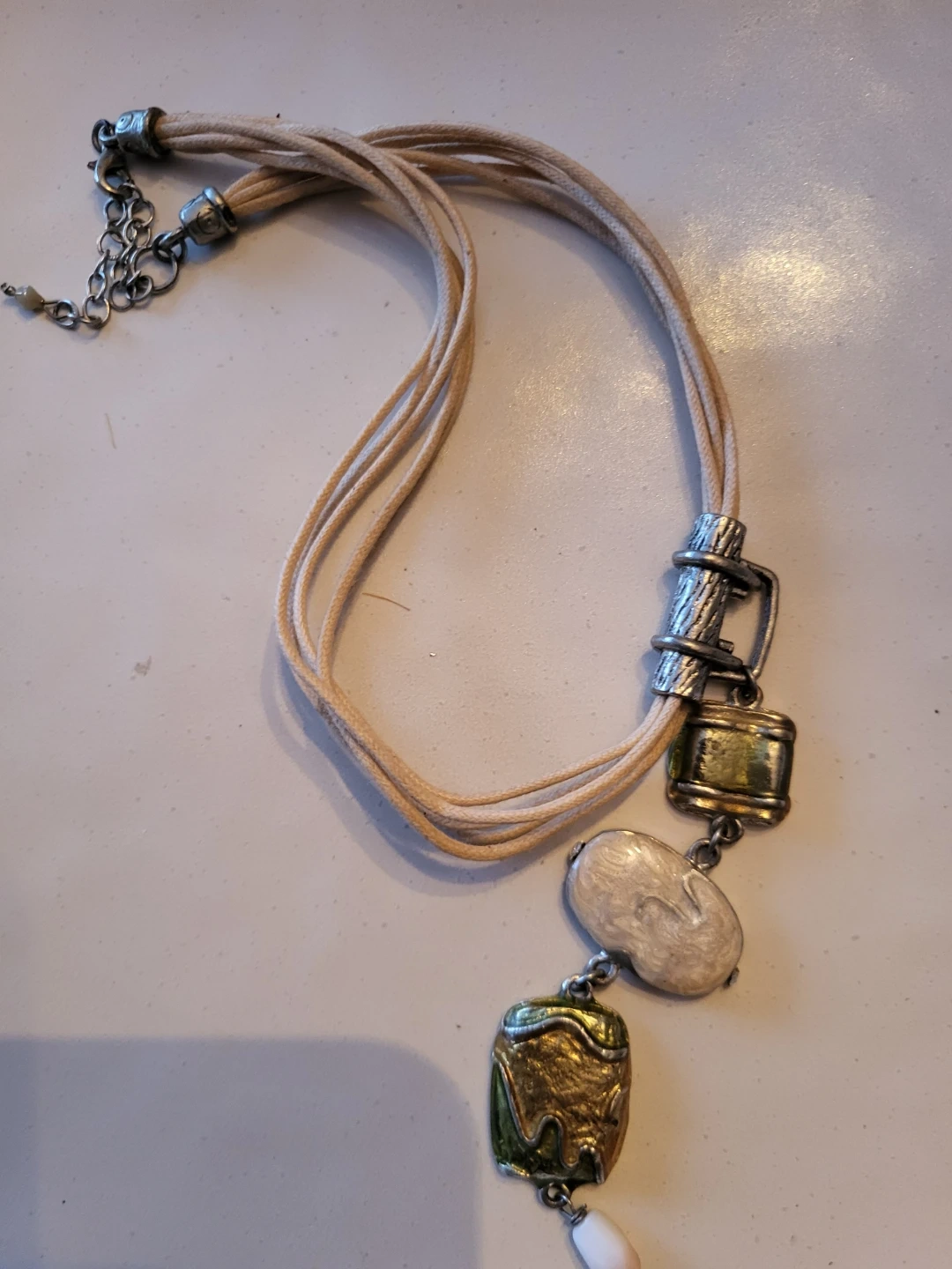 This necklace features multiple charms with gold, silver, and white accents. The cord is a light tan colour and it has an extender chain for adjustable length.