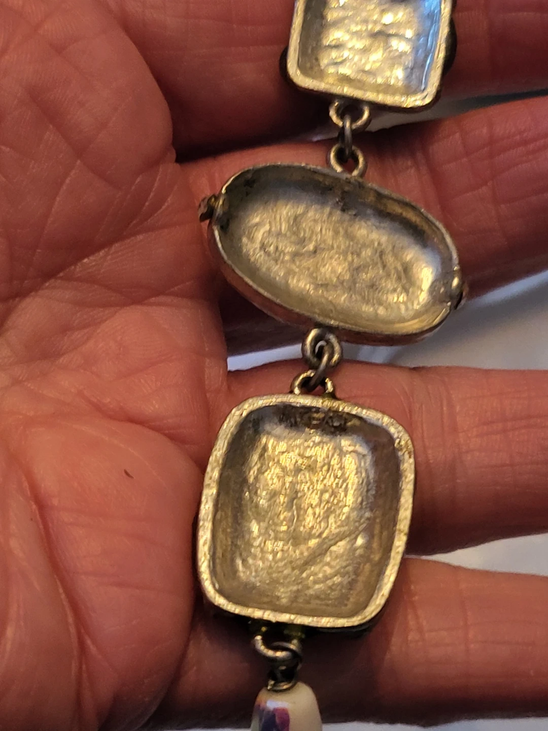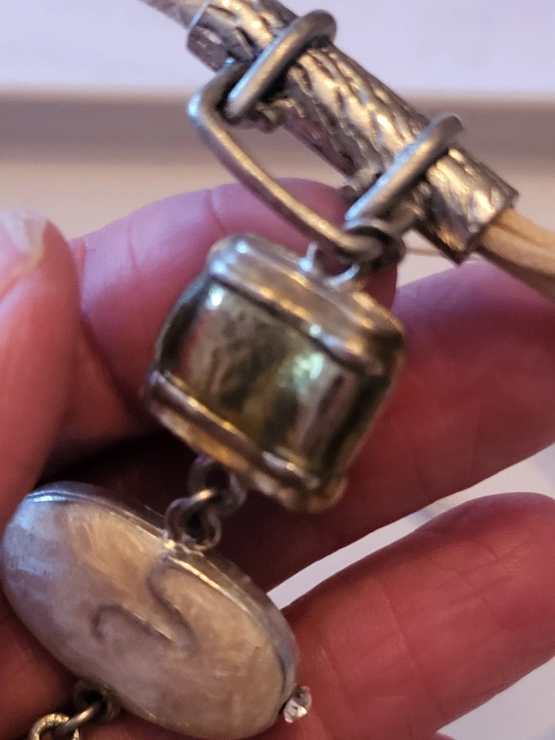 This necklace features multiple charms with gold, silver, and white accents. The cord is a light tan colour and it has an extender chain for adjustable length.