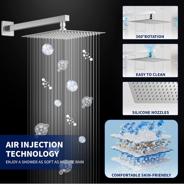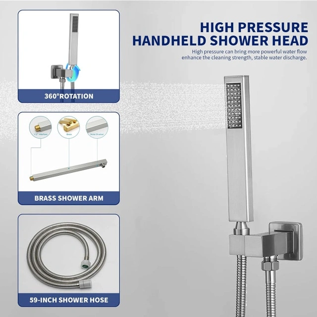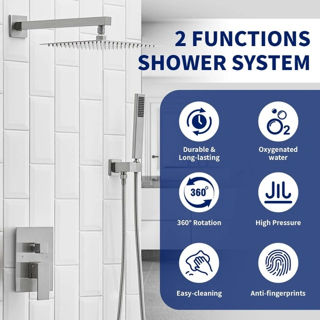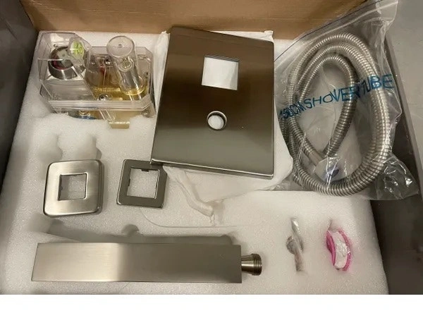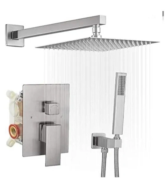 BWE Shower System Brushed Nickel 10 Inch Square Bathroom Luxury Rain Mixer Shower Combo Set Shower Kit Wall Mounted Rainfall Head Shower Faucet Rough-in Valve Body and Trim Included - Brand New In Box - Standard U.S.Threads : Our connectors are standard 1/2 NPT tapered threads, compatible with most existing shower systems. All hardware and parts are included - Pressure balance valve's cartridge monitor water pressure balance, helping to protect you from being scalded by sudden changes in hot or cold water pressure - Air Pressure Technology : Inject the air into rain shower head to mix water with air, and the water pressure up to 2.5GPM instantly, giving you a pleasant shower; with self-clean nozzle, easy to clean and maintain - Brushed Nickel Appearance - With the Brushed Nickel appearance of European and American style and the multi-layered electroplating passing the Salt Spray Test, it can easily face the surface corrosion by humid environment in the shower room