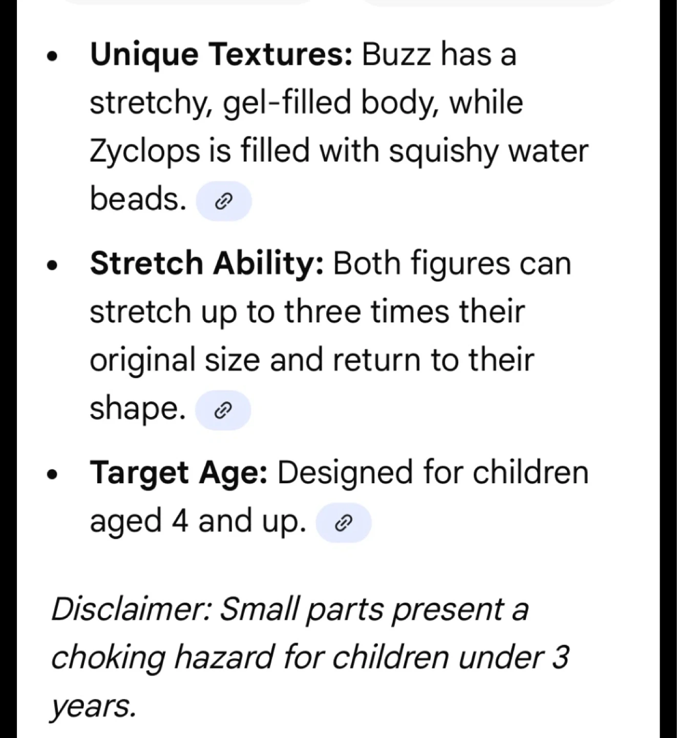 This set features a stretchy, gel-filled Buzz Lightyear and a squishy water bead-filled Cyclops figure. Both figures can stretch up to three times their original size and return to their shape. Designed for children aged 4 and up.