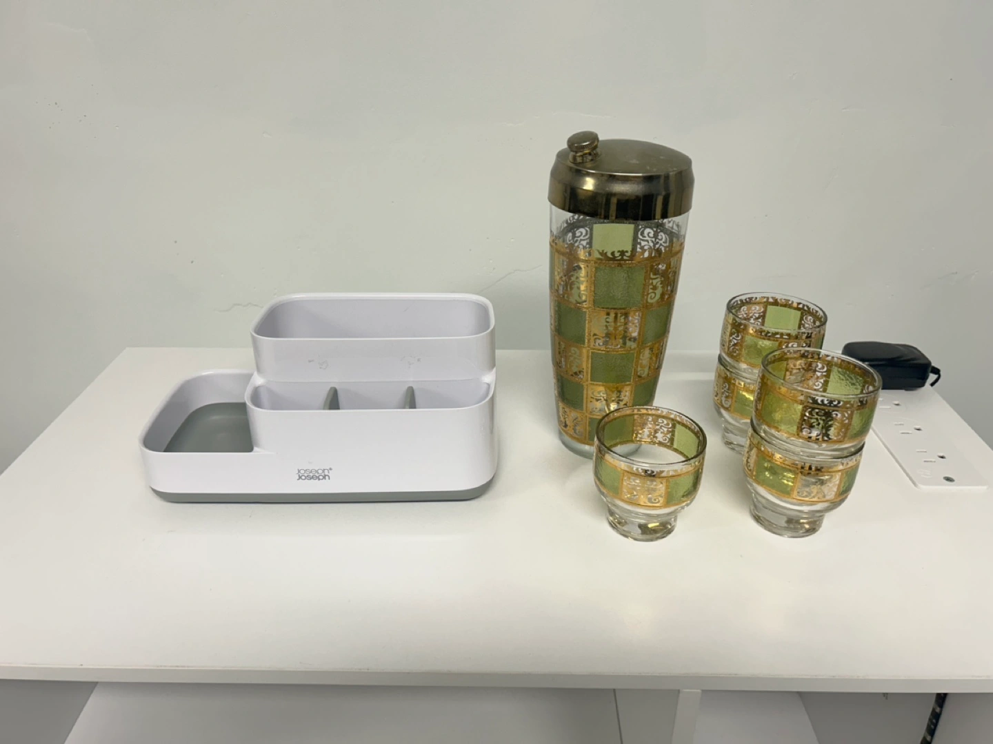 A countertop organizer and cocktail set with a shaker, four glasses, and a dish for holding utensils.