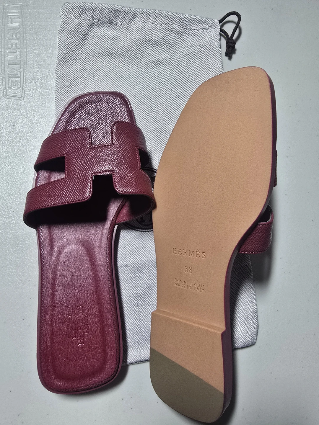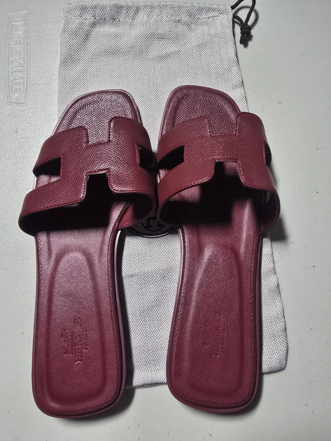 Selling a pair of Hermès Oran sandals in size 38. They are a beautiful burgundy color and come with the original dust bag. These sandals are a stylish and comfortable addition to any wardrobe!
