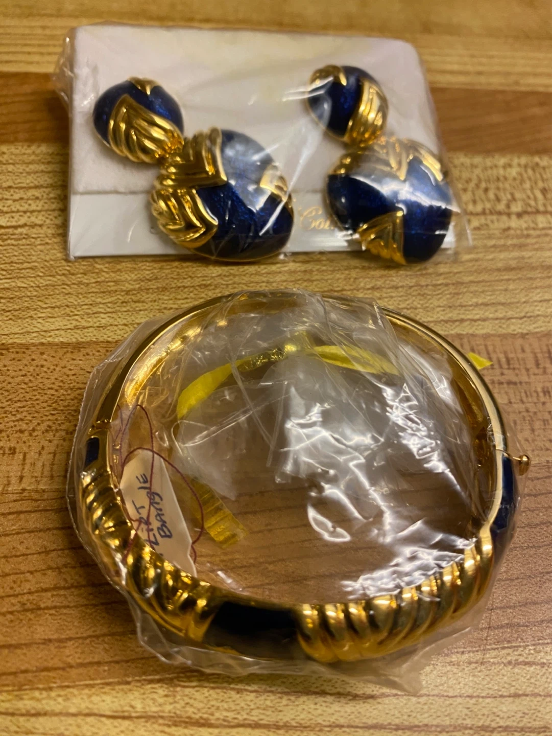 A set including a dark blue and gold tone bracelet with matching clip-on earrings. These pieces have a glossy blue enamel finish with gold tone metal accents.