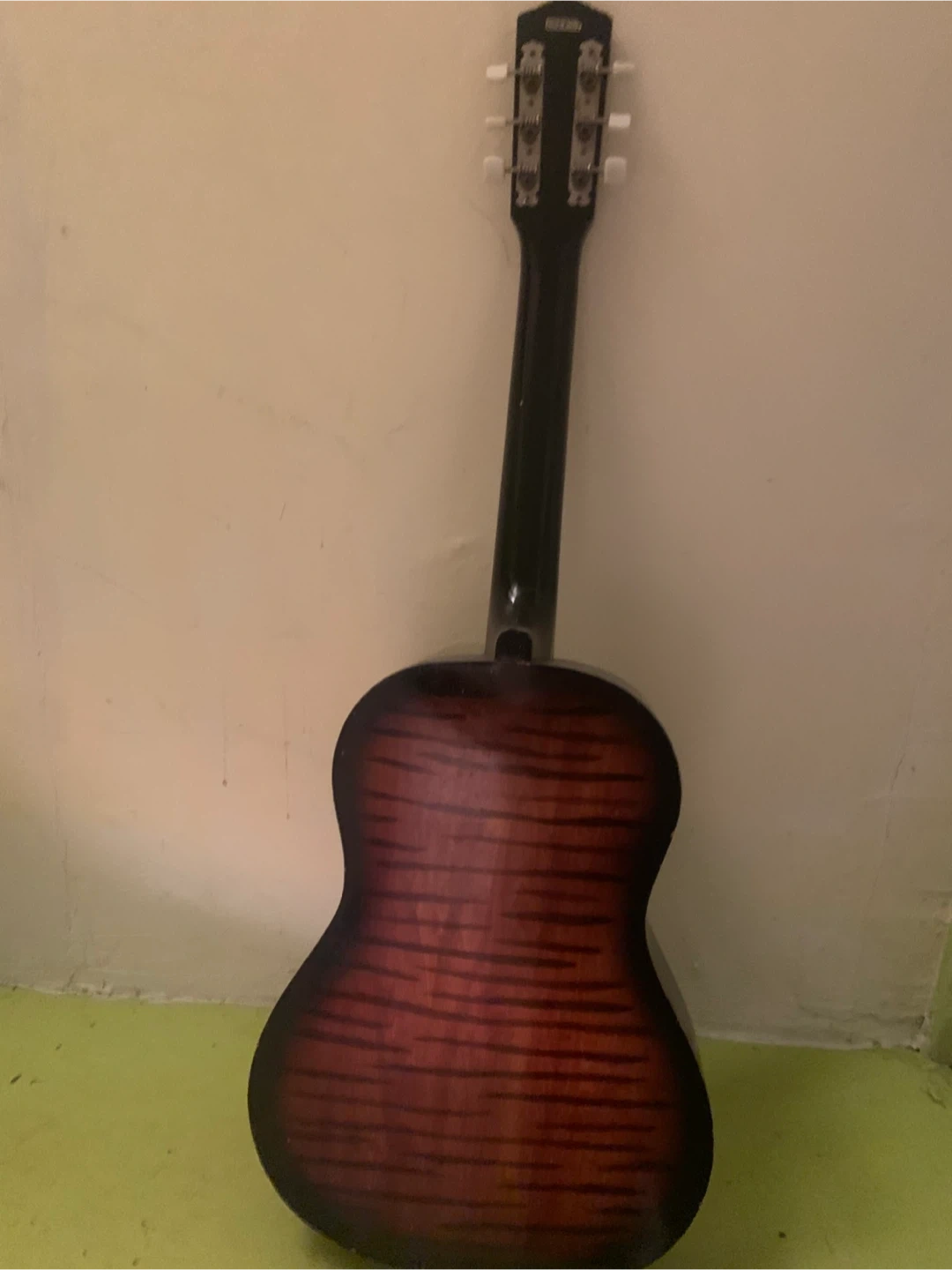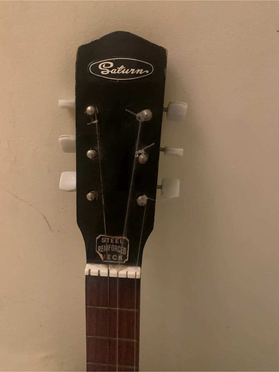 This is a vintage Saturn acoustic guitar made in Japan. It has a steel-reinforced neck. The body has a sunburst finish with tiger stripe accents.