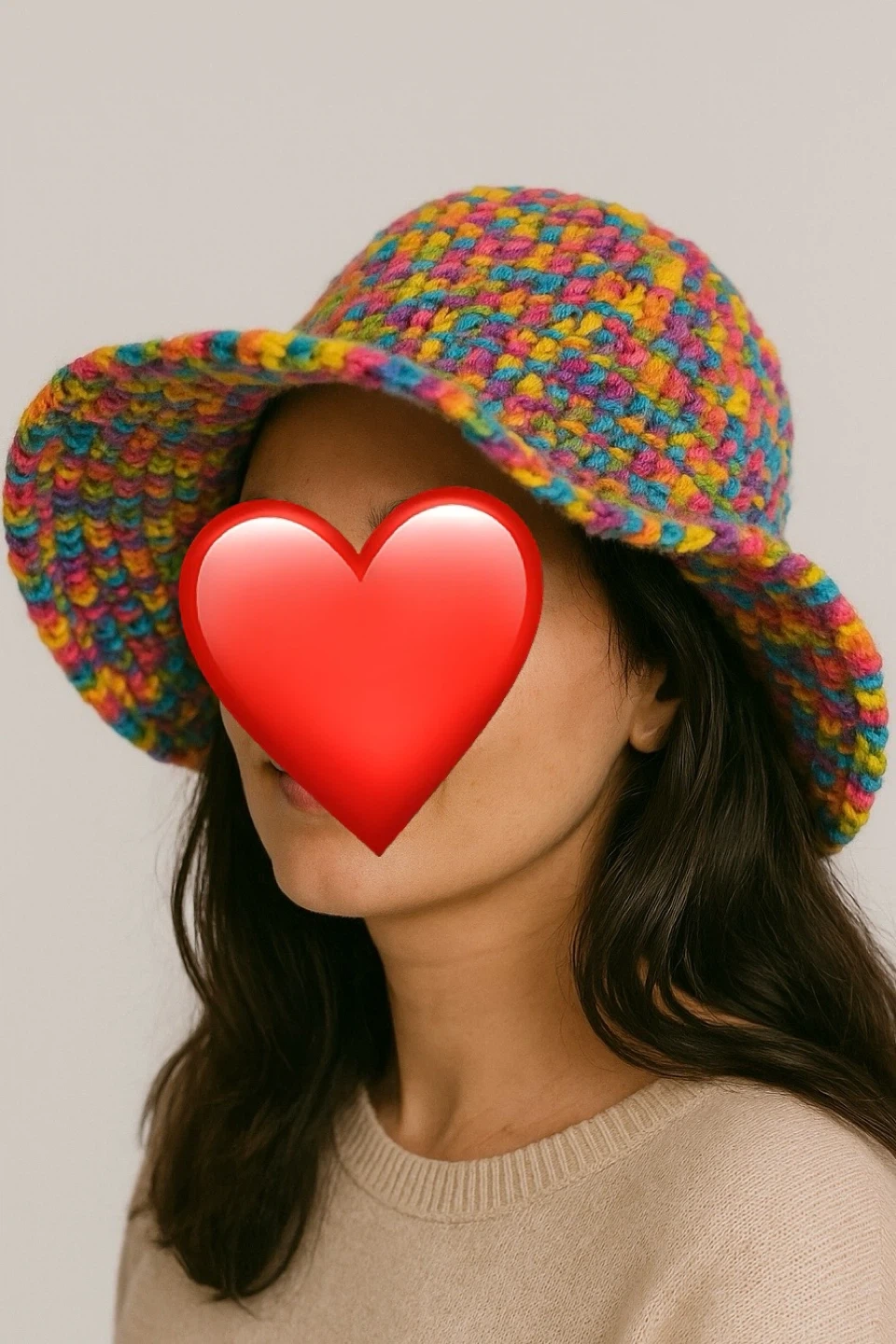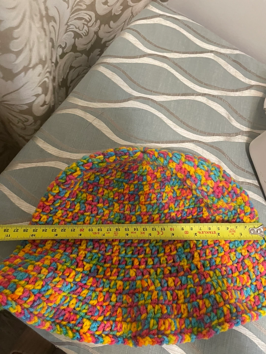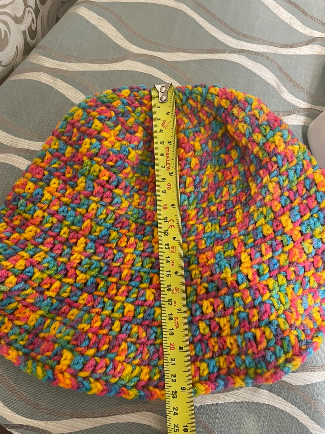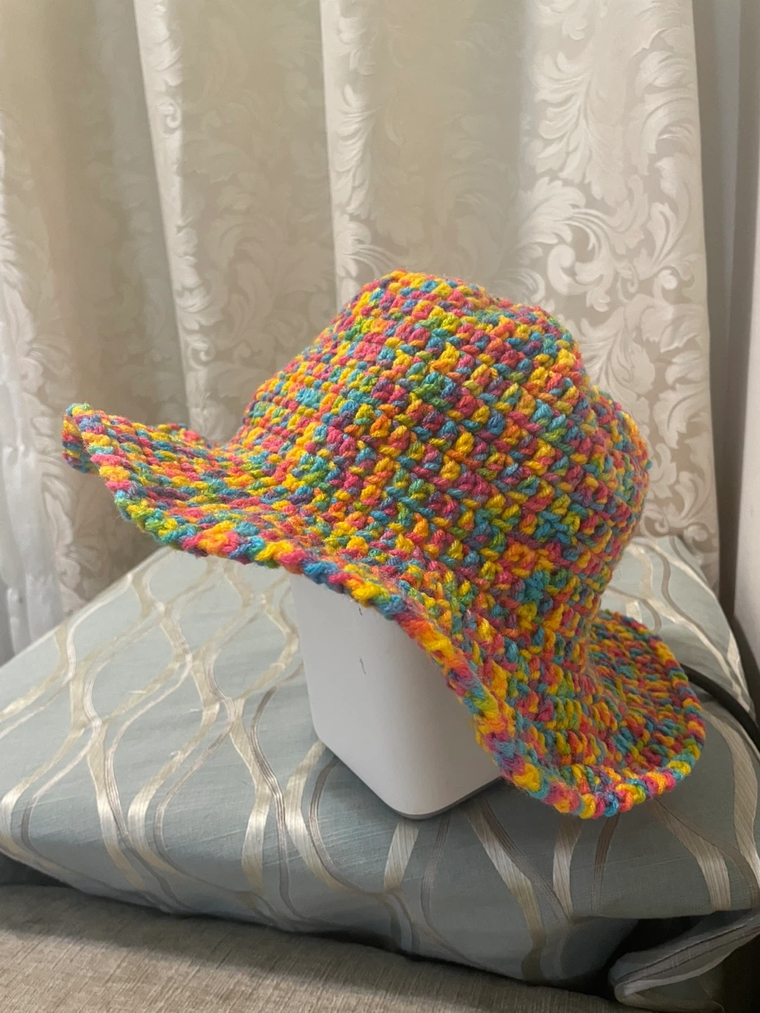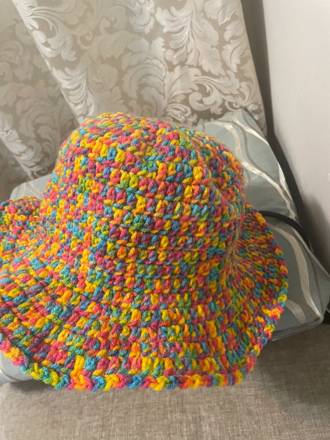 Selling a handmade crochet bucket hat! It's super colourful with a rainbow of yellows, pinks, and blues. The hat is about 9.5 inches in height.
