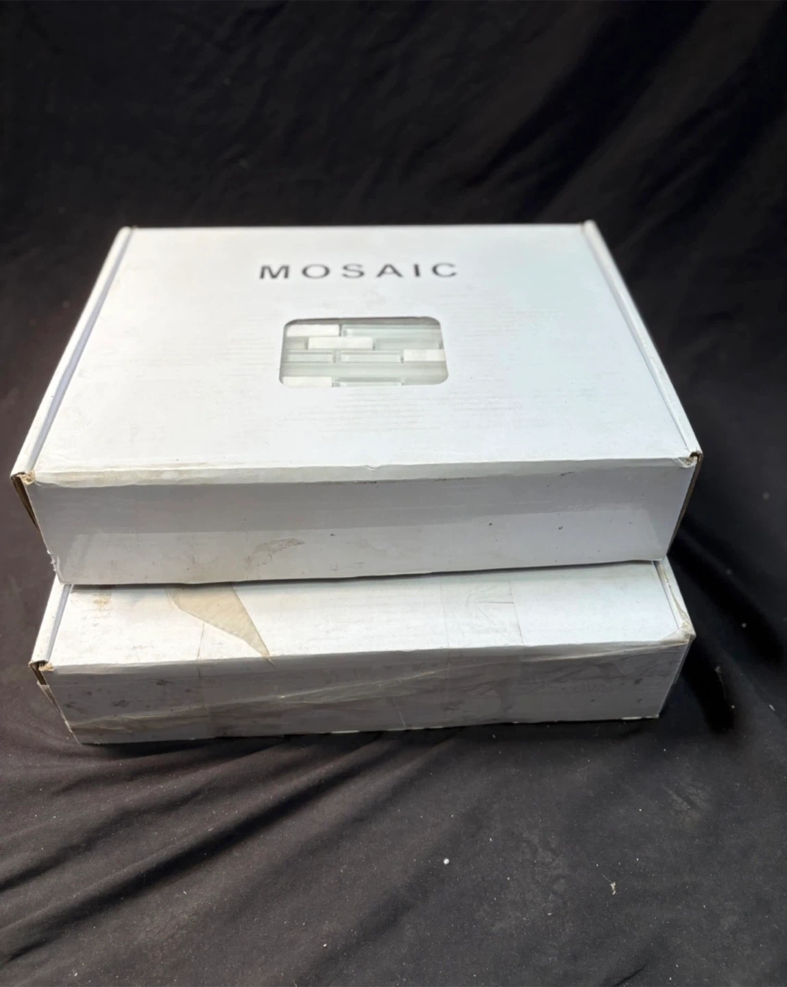 The tiles are white and clear, and each sheet is 29.6 cm x 29.6 cm. There are 11 sheets in the box, covering 1 square metre. $40 for both boxes