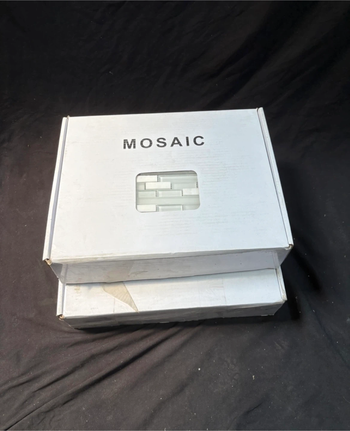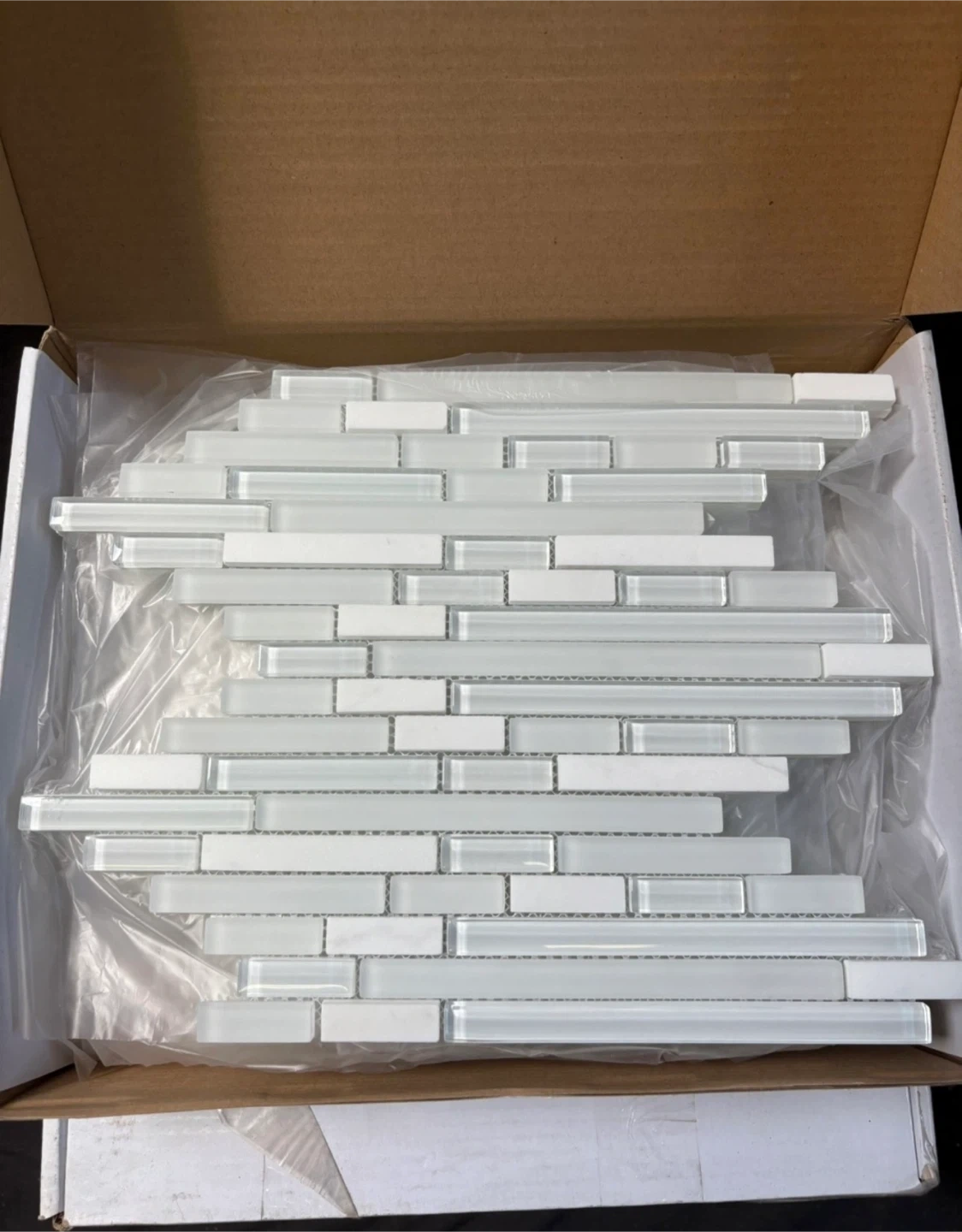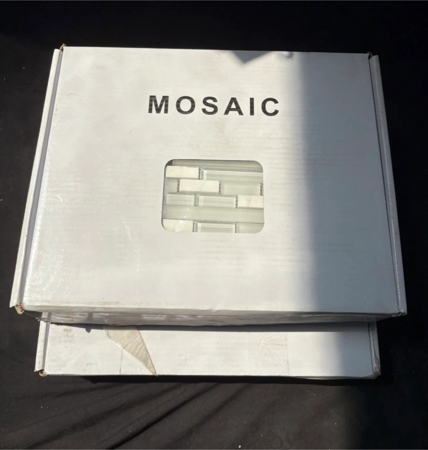 The tiles are white and clear, and each sheet is 29.6 cm x 29.6 cm. There are 11 sheets in the box, covering 1 square metre. $40 for both boxes