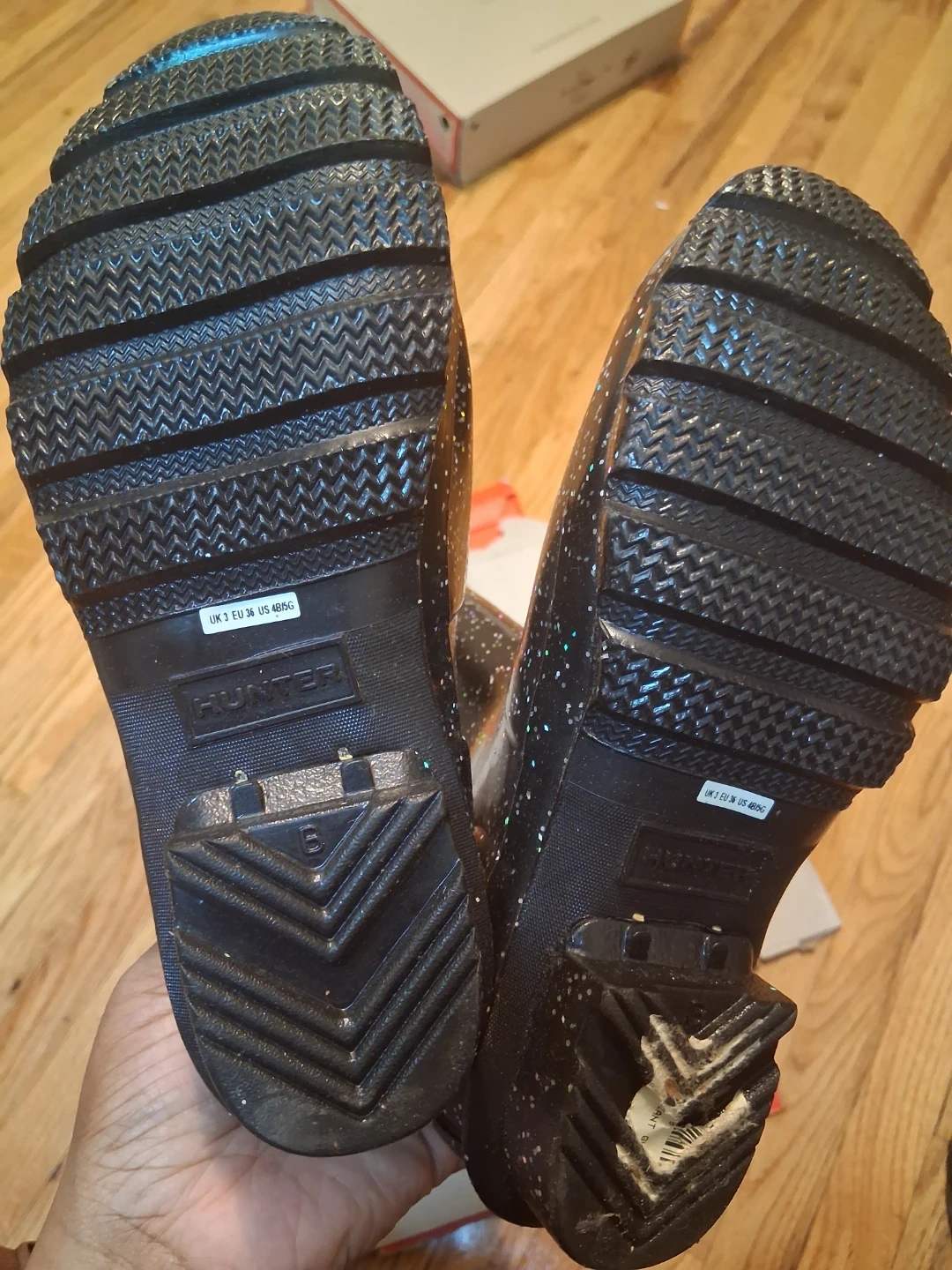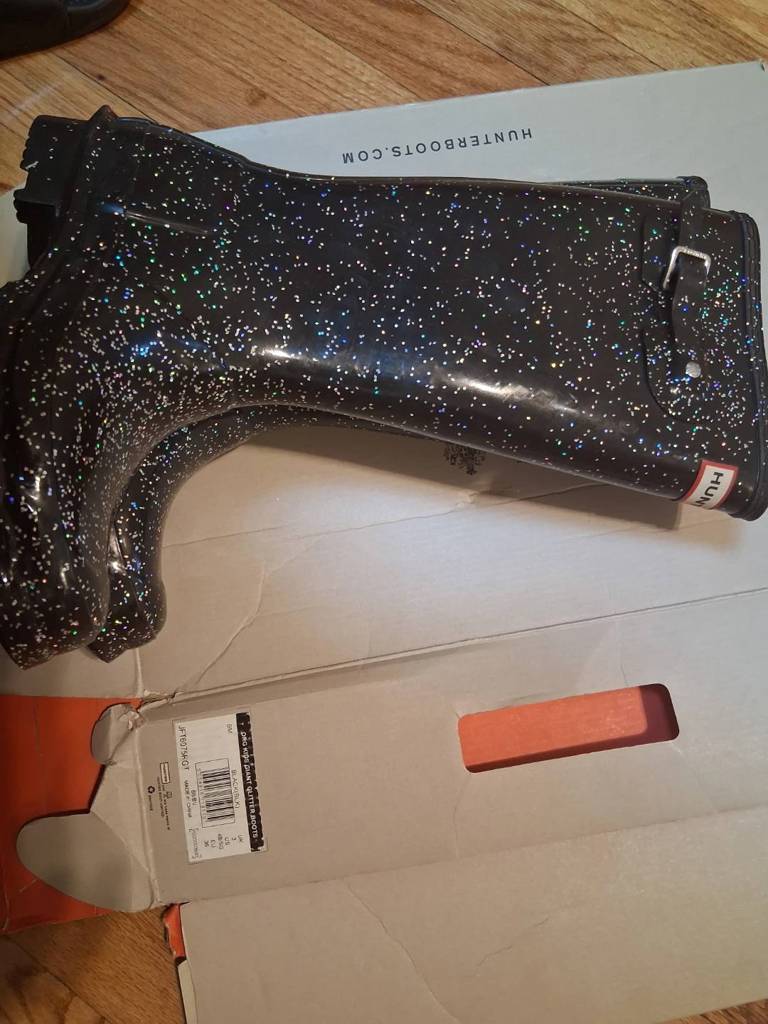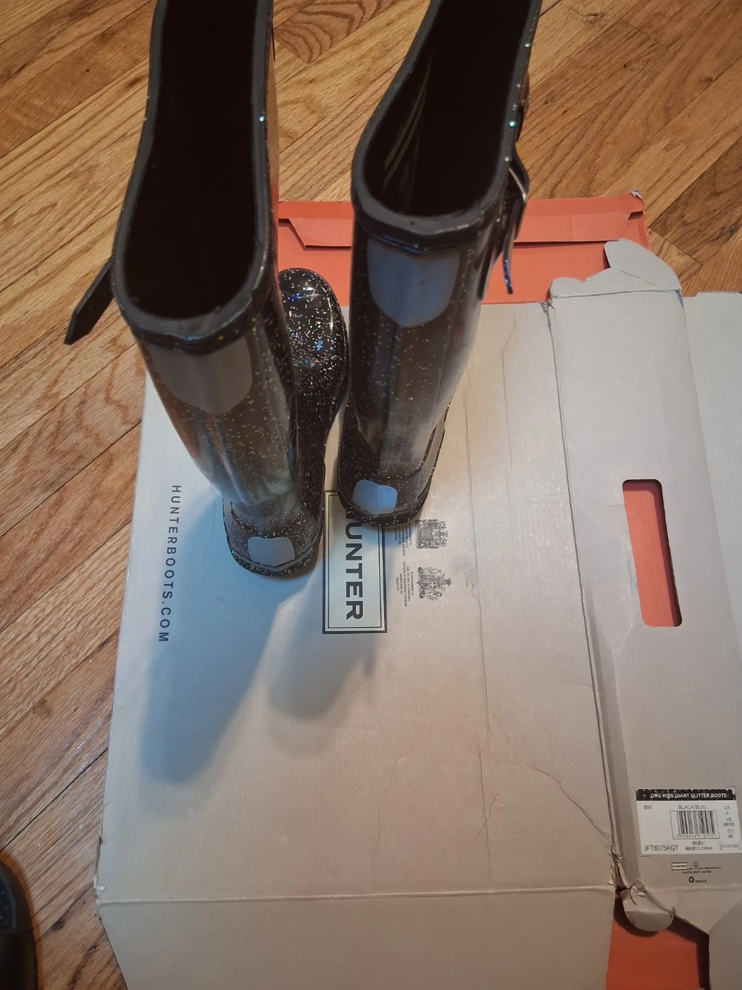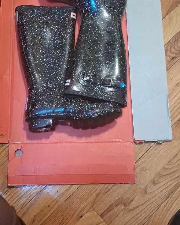 Spring Cleaning Bundle and save ...These Hunter Original boots feature a black glitter finish. Rubber material. Includes original box. Kids size 6.