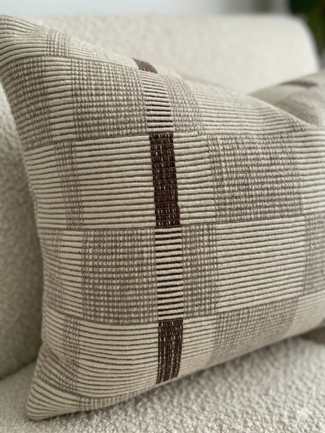 Featuring a rich, woven grid pattern in earthy browns and creams, it’s designed to bring effortless warmth and architectural detail to your favorite sofa or nook.