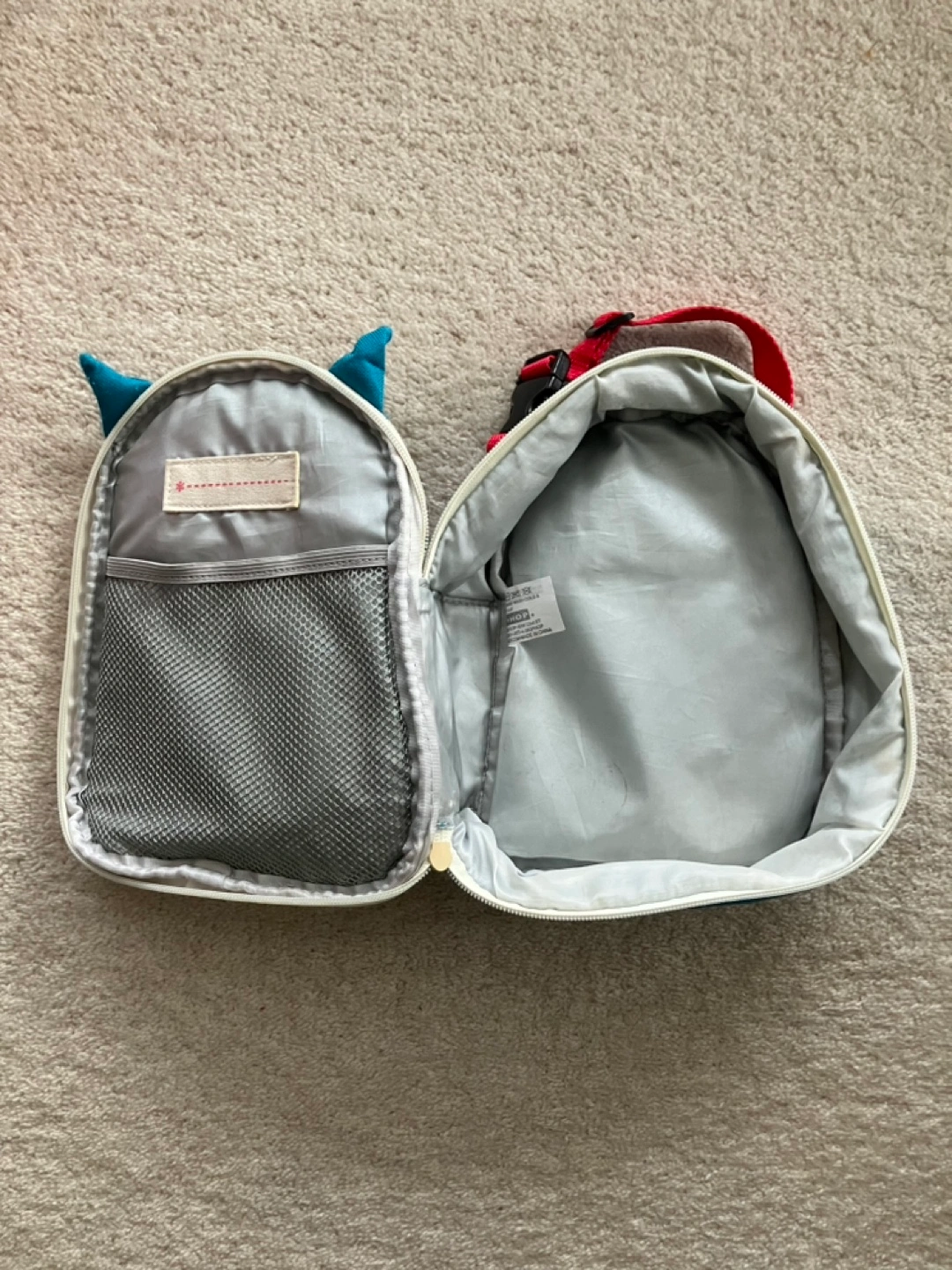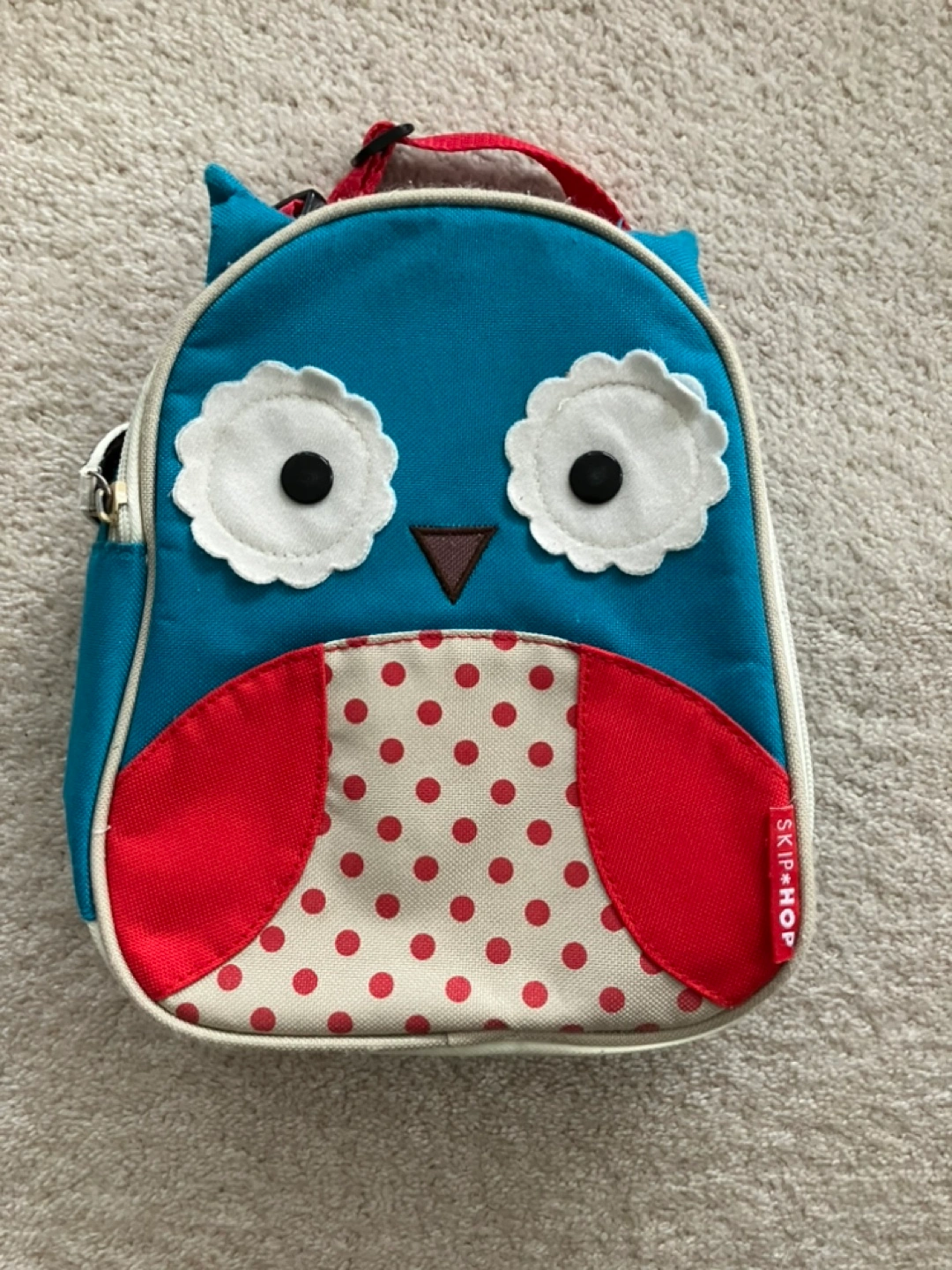 Adorable owl lunch box. Features insulated interior and adjustable strap. Faint marking on back (see photo).