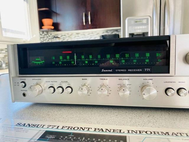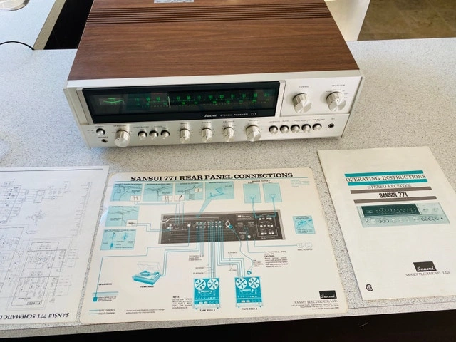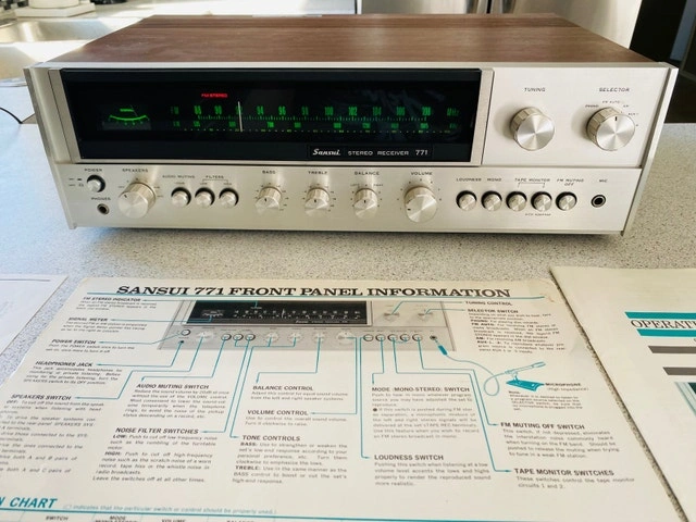 Classic 1970s Sansui 771 Stereo Receiver, known for its powerful sound and durable construction. Delivers a rich, warm sound, perfect for any audiophile or anyone seeking high-quality stereo audio. In excellent working condition with the original manual. Features AM/FM stereo tuner with great reception, multiple inputs (auxiliary, tape, phono/turntable), and tone controls (bass, midrange, treble). Fully operational, cleaned, and serviced, with minimal signs of use. Classic silver faceplate with large, easy-to-read dials. Standard dimensions, approx. 21 lbs. Well-known for solid construction and exceptional sound quality, providing clear, dynamic audio. Cash and cashless payments accepted. For sale by owner. Curbside pickup available.