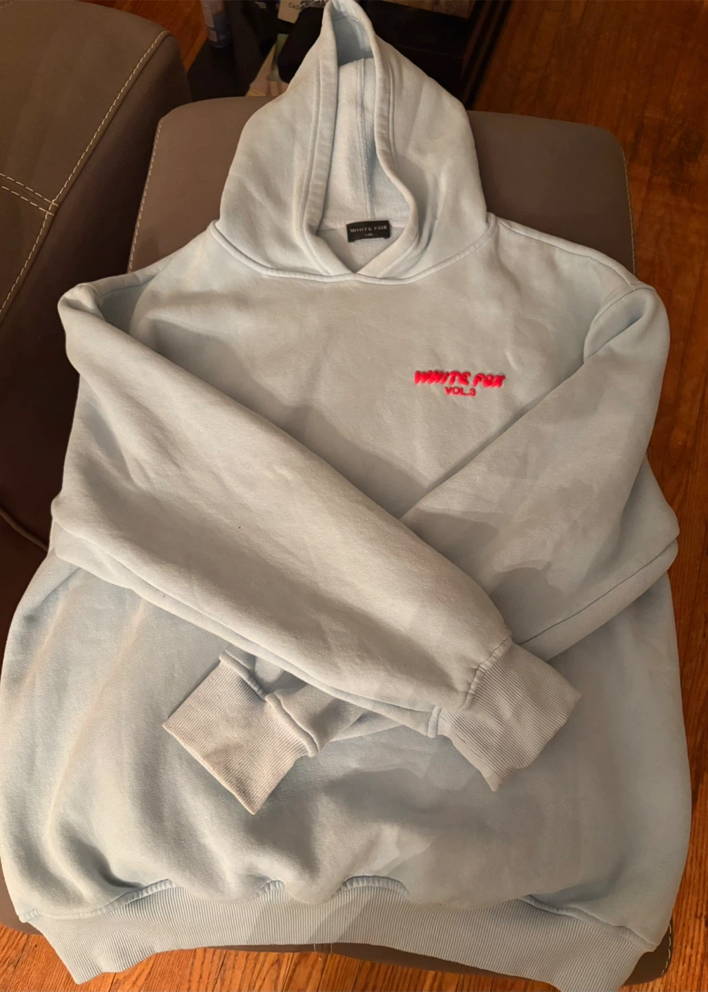 Light blue hoodie from White Fox, Vol. 3 collection. It's a comfy pullover style with a relaxed fit. Perfect for casual wear!