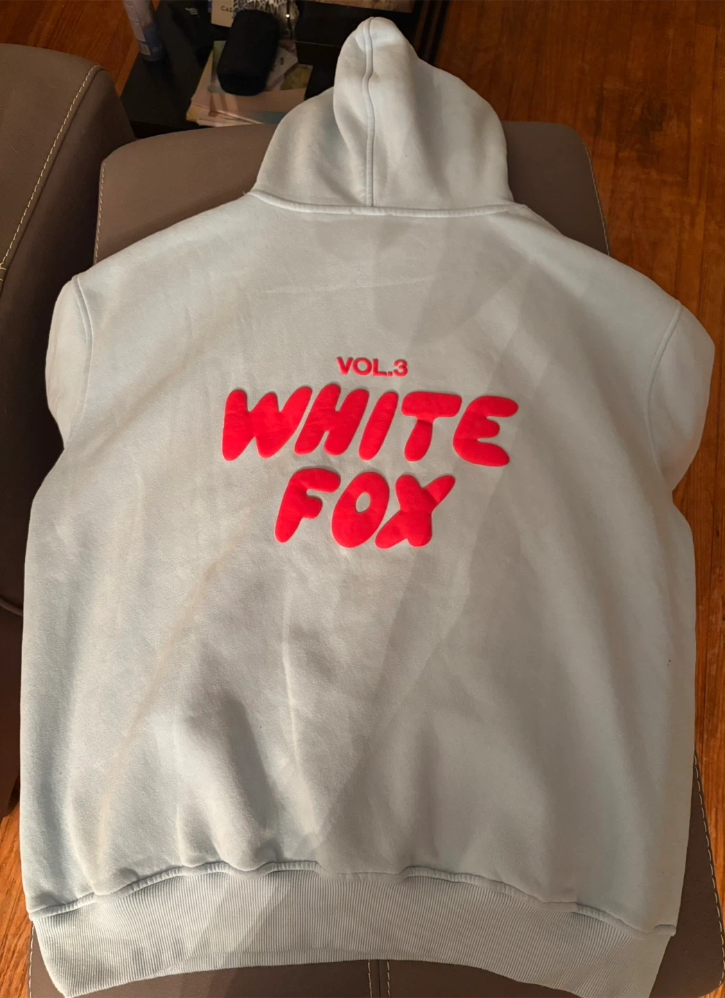Light blue hoodie from White Fox, Vol. 3 collection. It's a comfy pullover style with a relaxed fit. Perfect for casual wear!