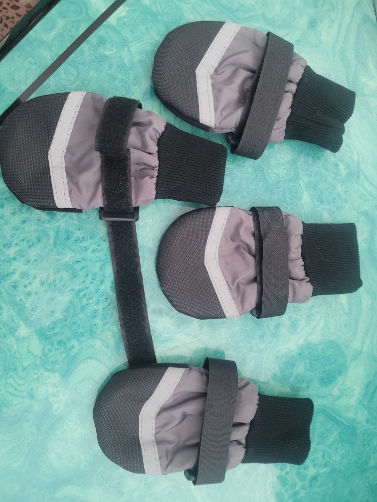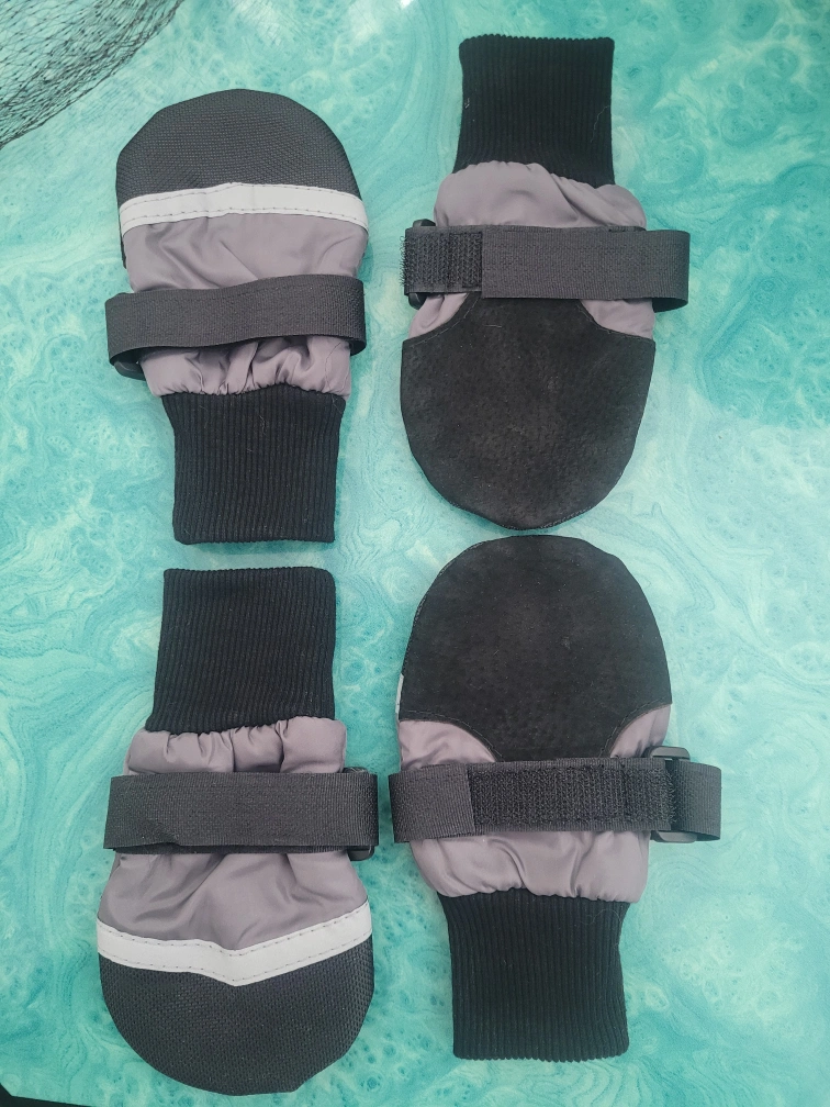 Set of four dog boots, grey and black. Weather proof. They have long adjustable velcro straps and reflective accents.